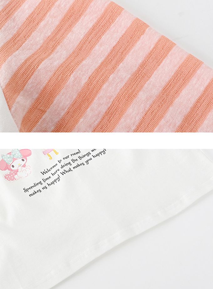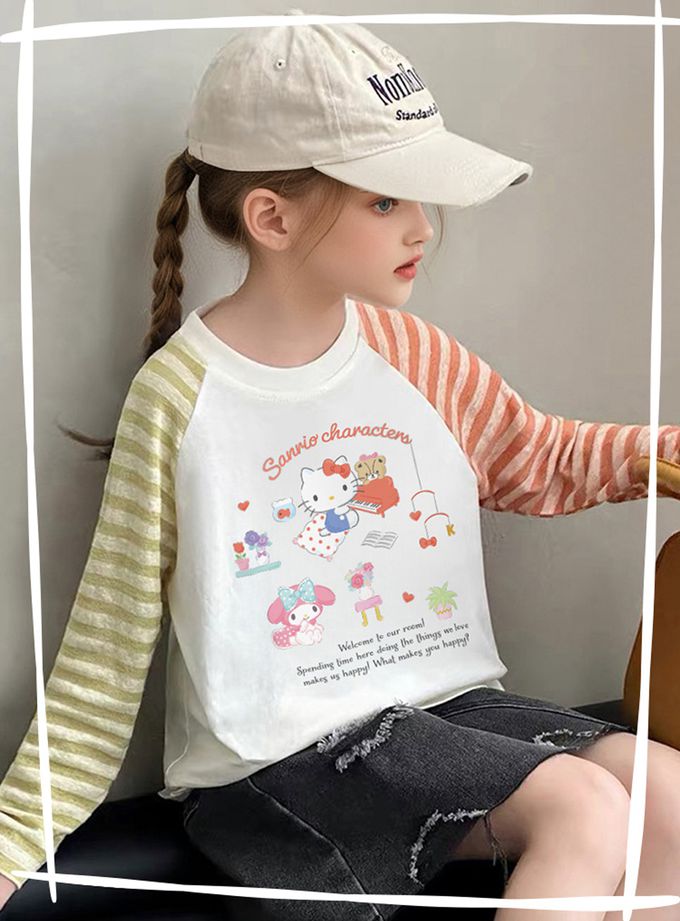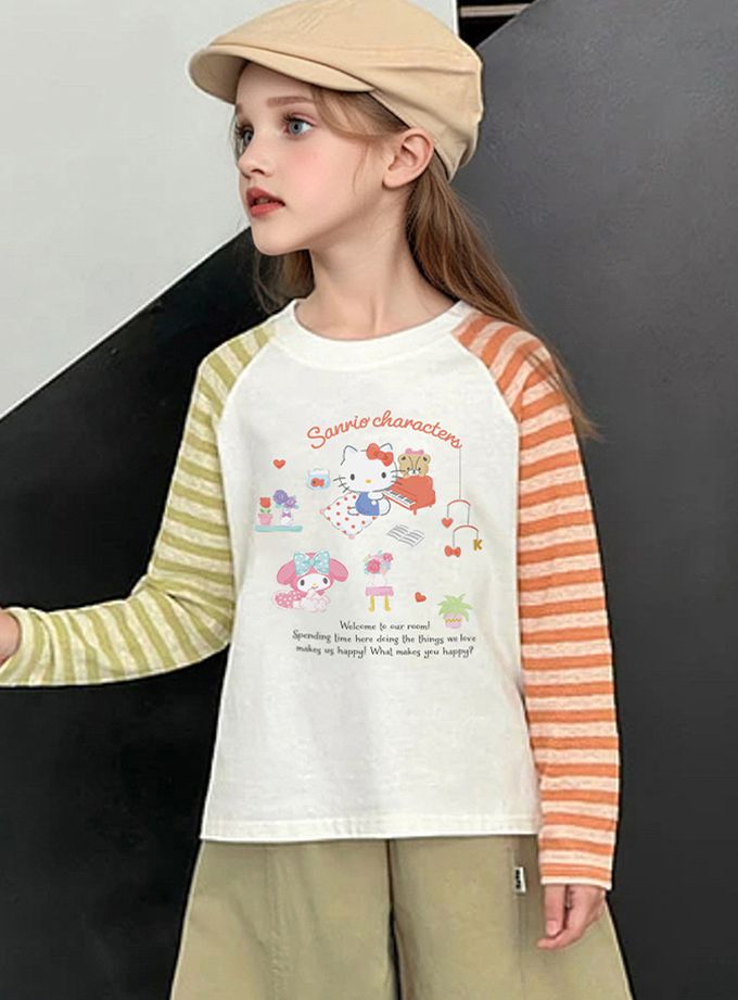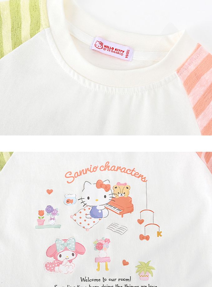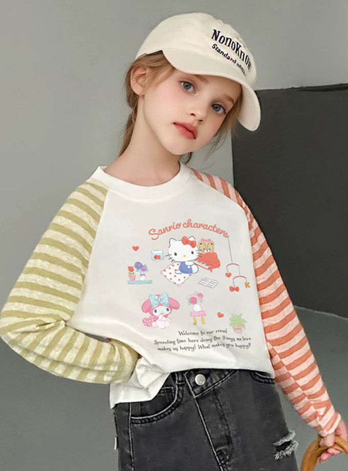 甜美條紋撞色長袖T恤-卡通人物美樂蒂/Hello Kitty-米白