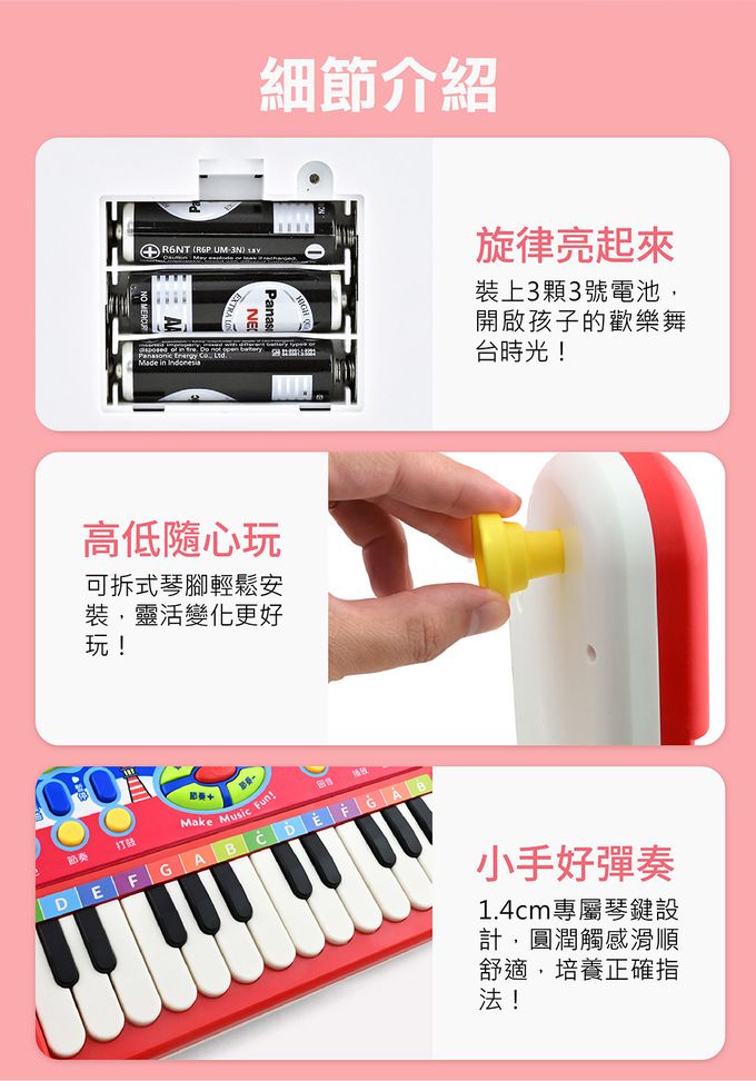 注意事項:琴譜*6張、腳架*4、type C傳輸線(無充電功能)*1、鋼琴譜架*1、鋼琴*1。 商品不附電池,需AA電池3顆。