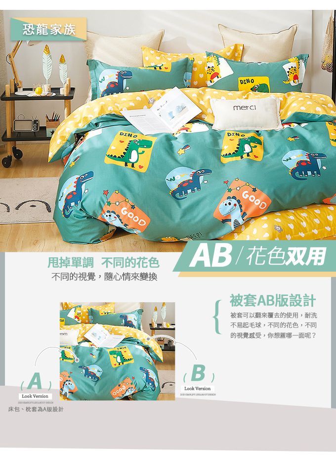 台灣製 極致純棉寢具組-恐龍家族-綠-雙人三件式床包組