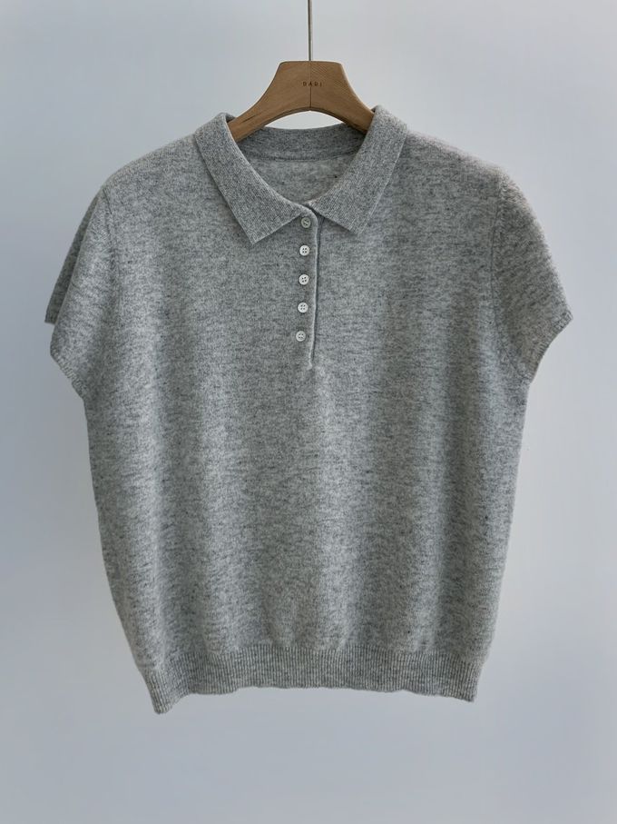韓國女裝連線 - 翻領小釦羊毛混織短袖上衣-淺灰 (FREE)