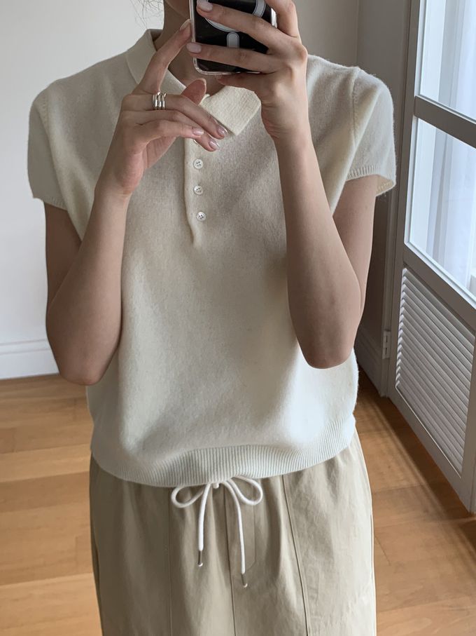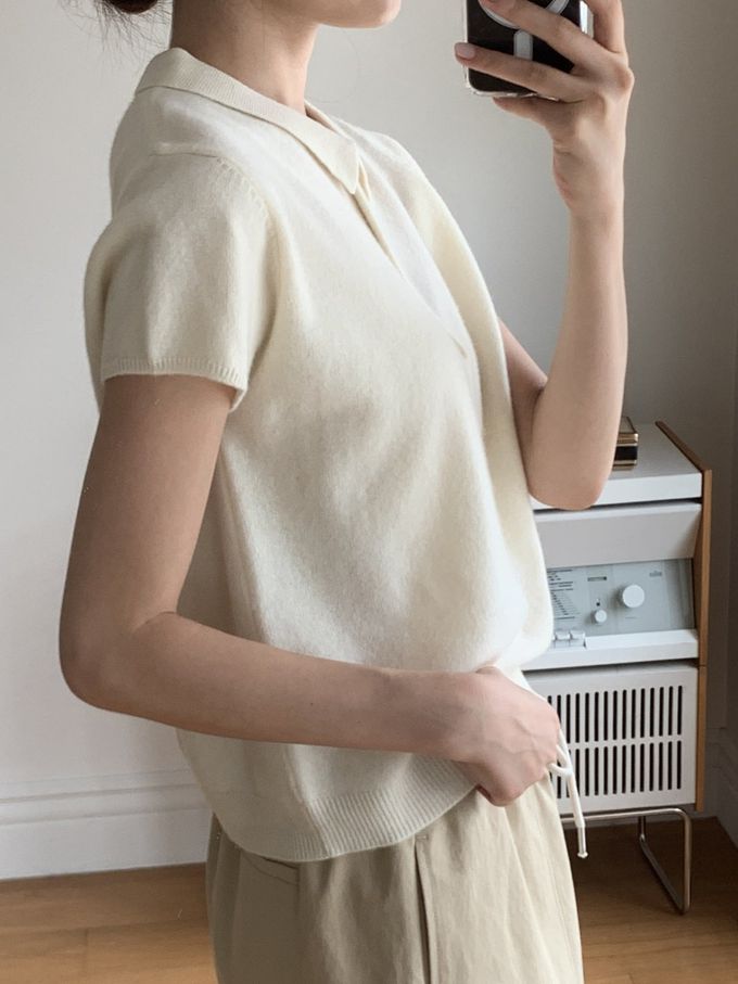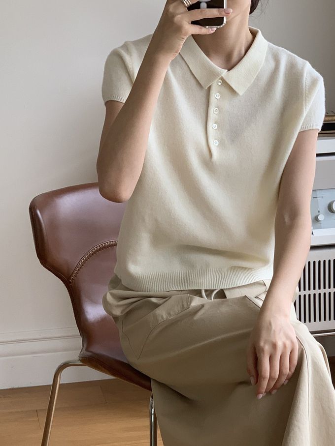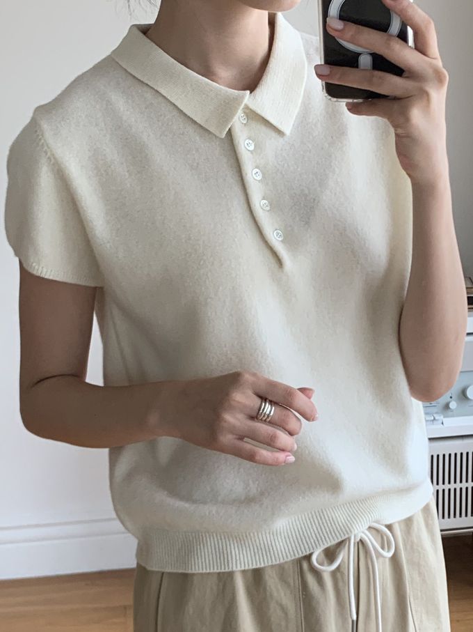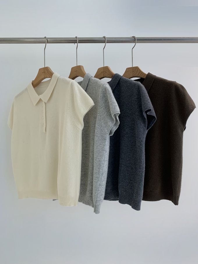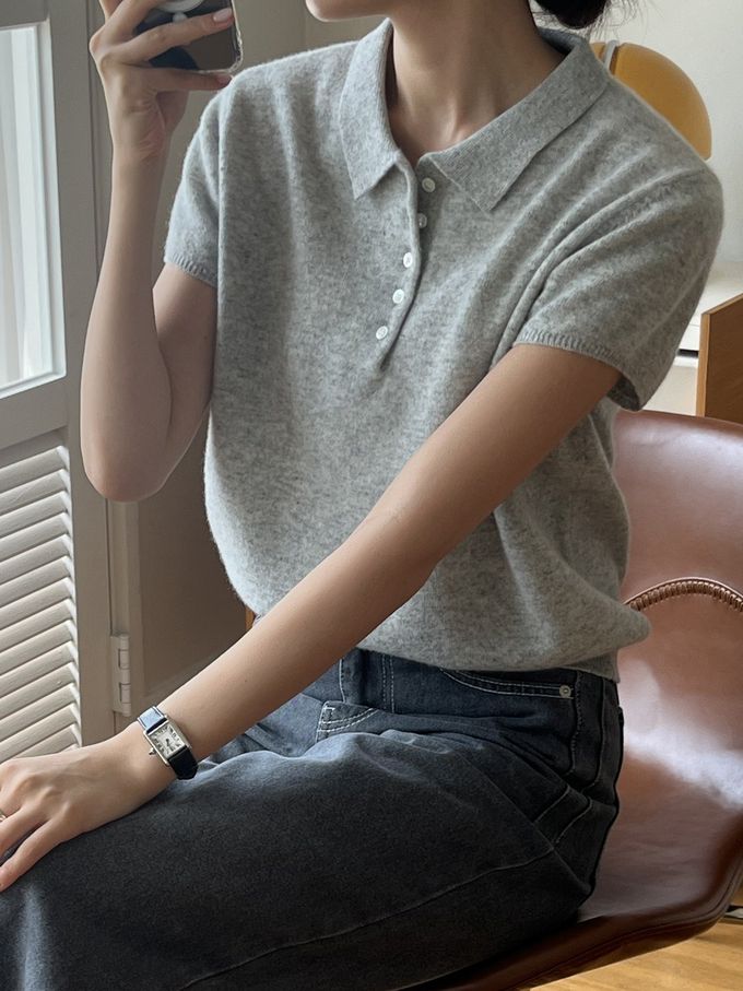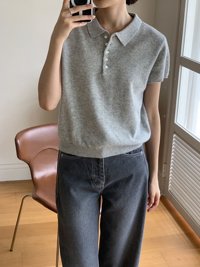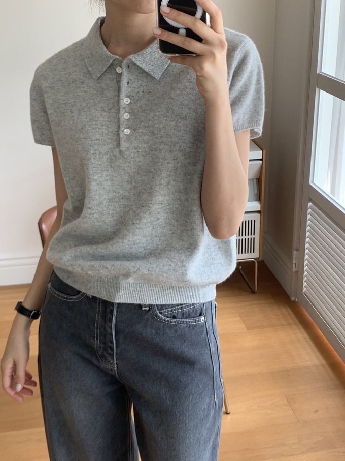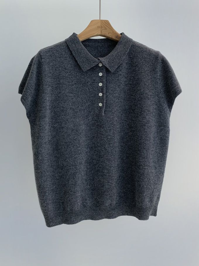 韓國女裝連線 - 翻領小釦羊毛混織短袖上衣-深灰 (FREE)