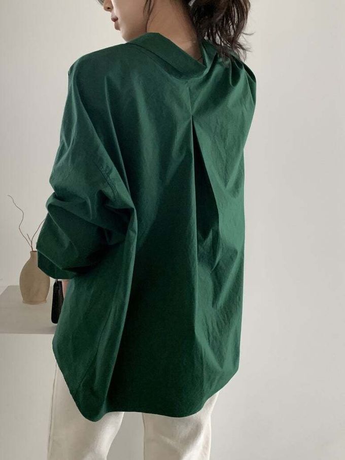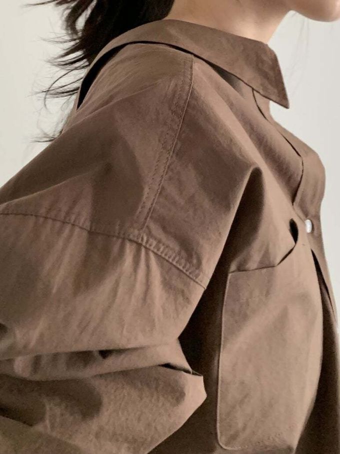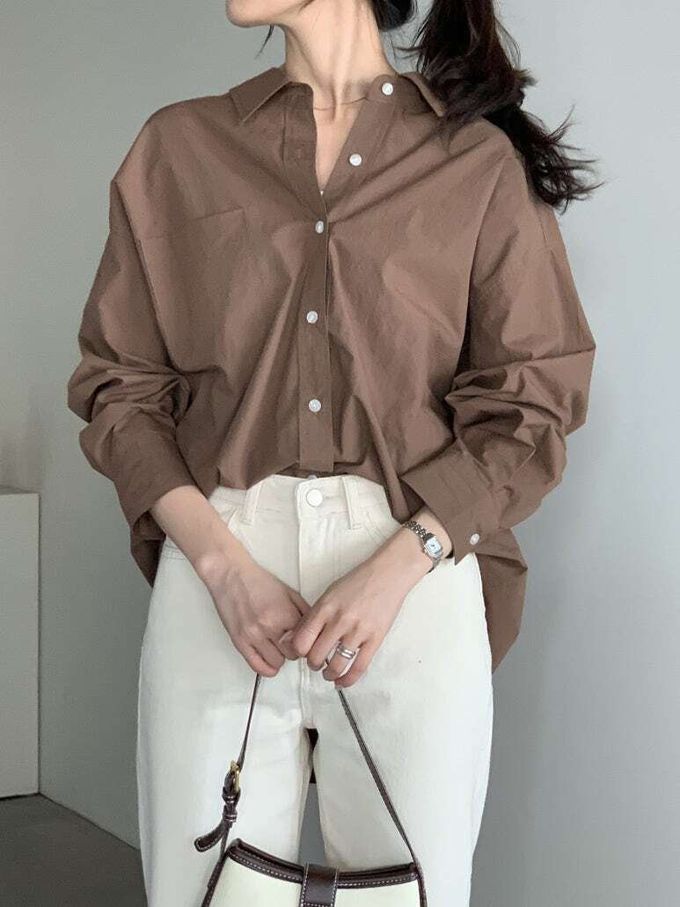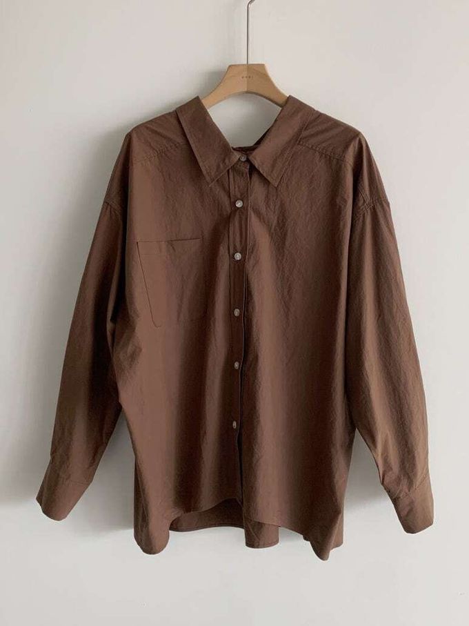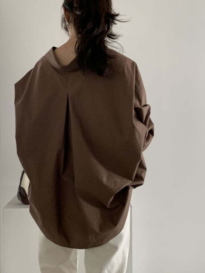 韓國女裝連線 - 簡約質感後背抓褶長袖襯衫-咖啡 (FREE)