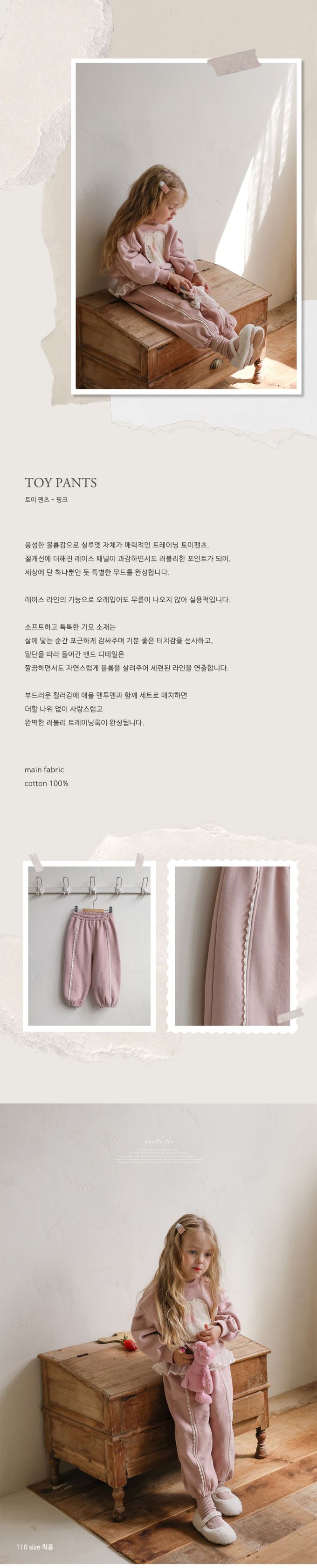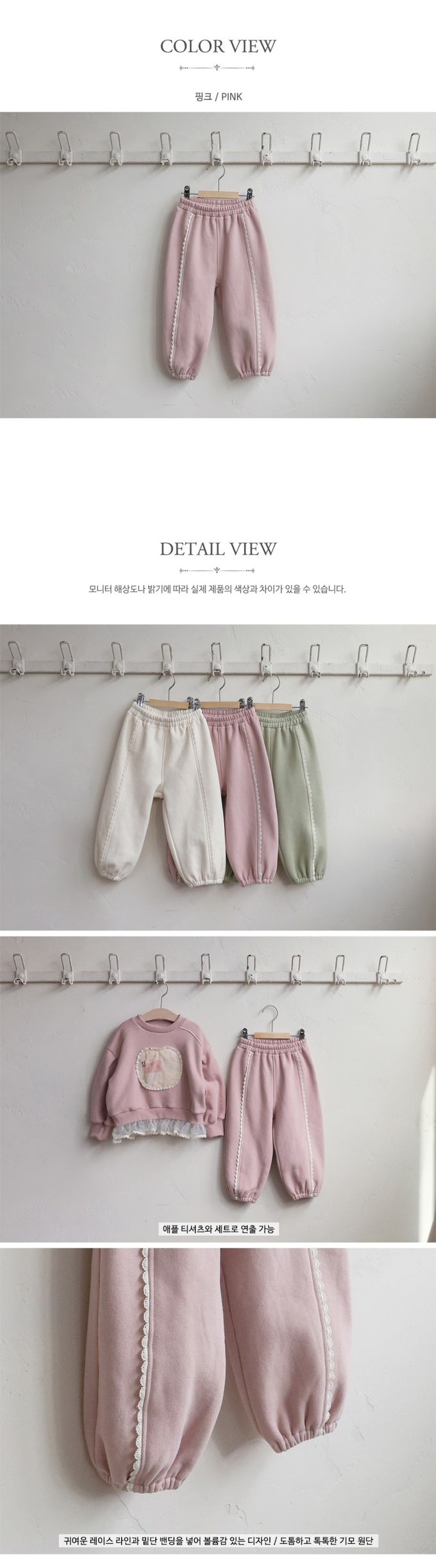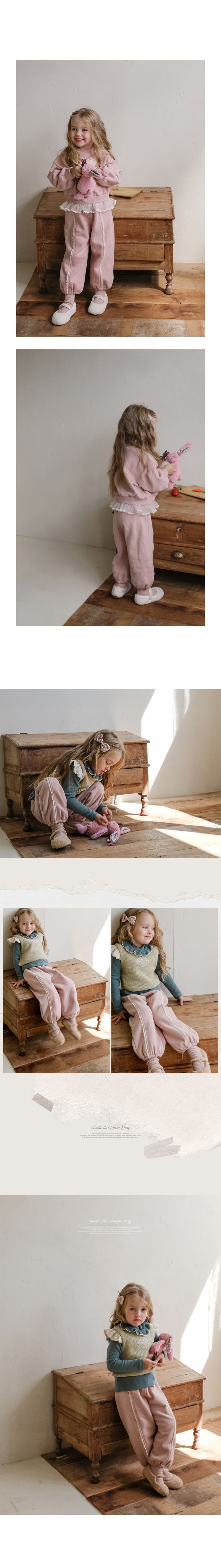 韓國南大門童裝 - Puellaflo (內磨毛)鬆緊腰小蕾絲邊點綴縮口長褲-粉
