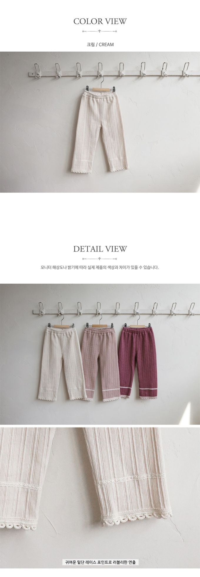 韓國南大門童裝 - Puellaflo (內磨毛)鬆緊腰蕾絲花邊羅紋長褲-米