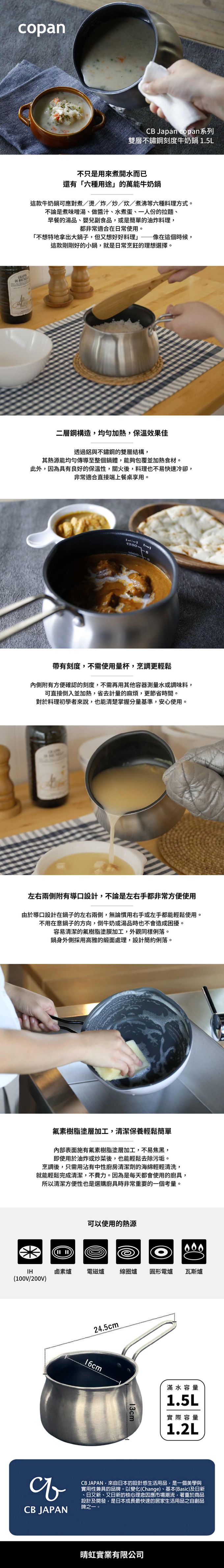 此款二層鋼構造牛奶鍋,是一款具有煮、燙、炸、炒、炊、煮沸等六種用途的實用小鍋,因為能夠均勻加熱料理,且具有良好的保溫性能,可以讓料理不易快速冷卻,並可直接端上餐桌享用美食。