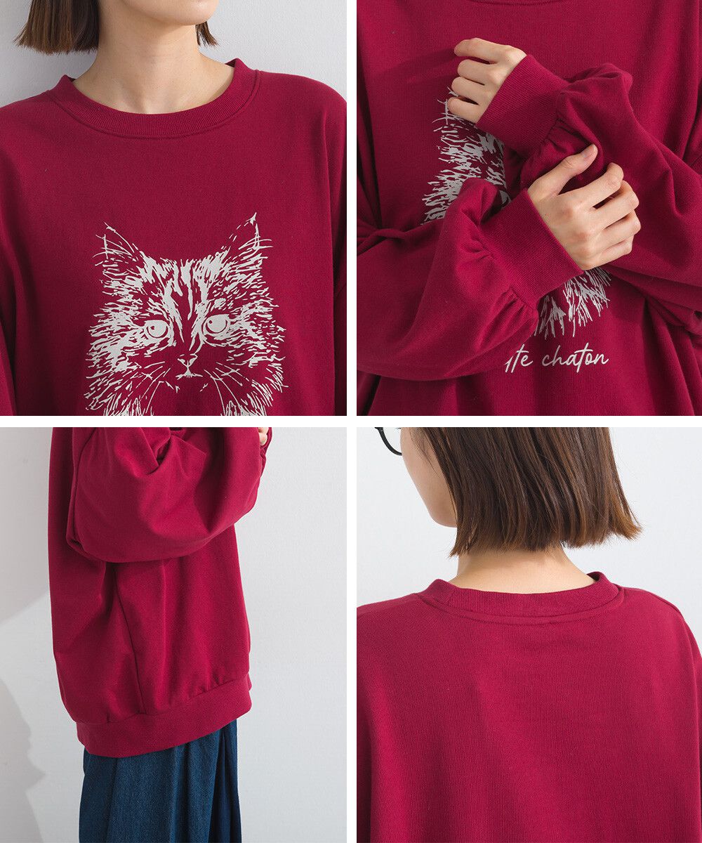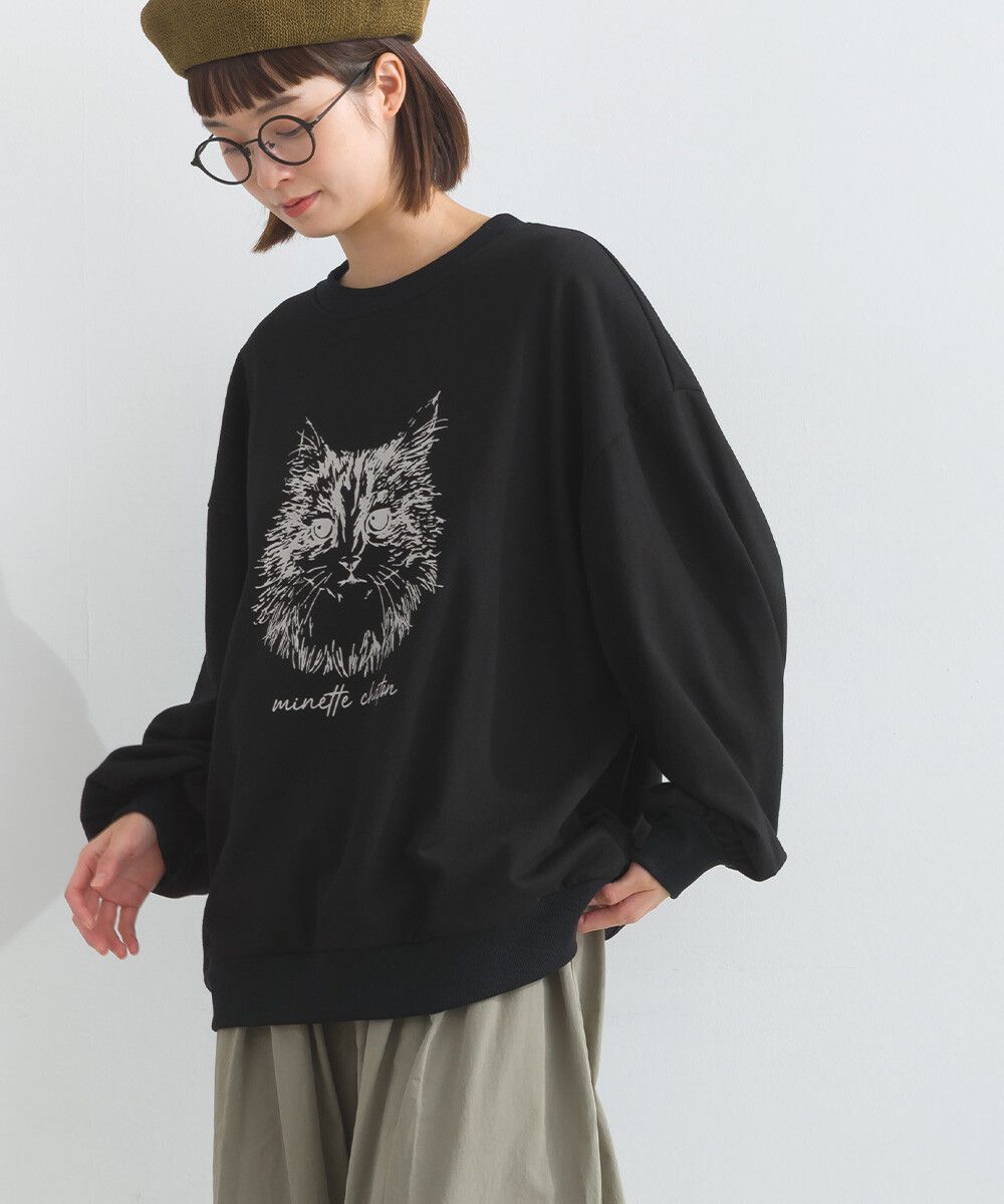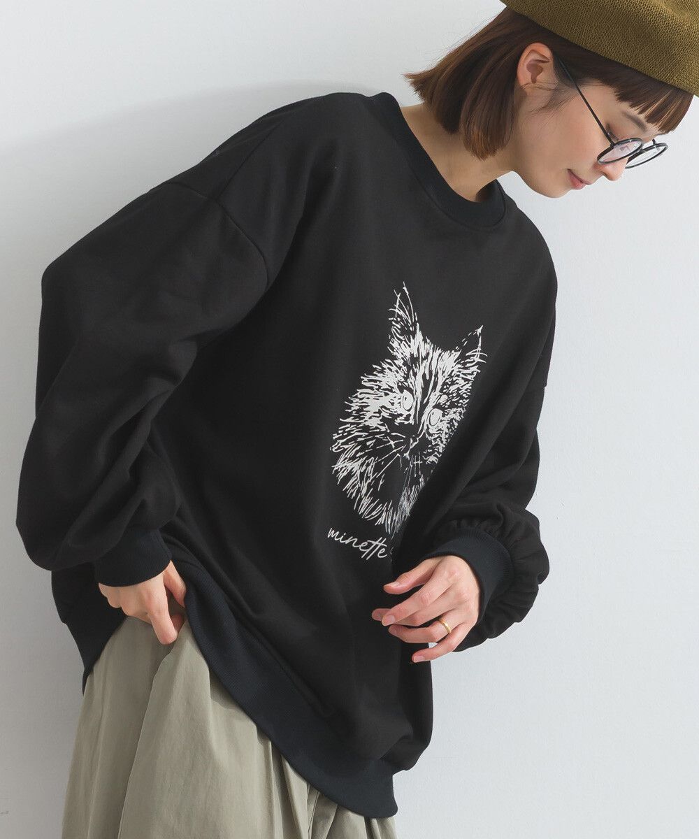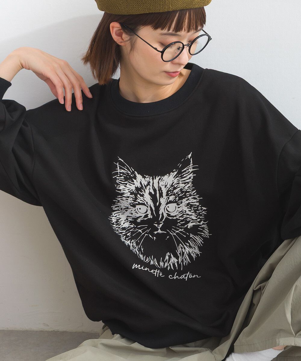 日本 Lupilien - 線條貓咪印花裏毛長袖上衣-黑