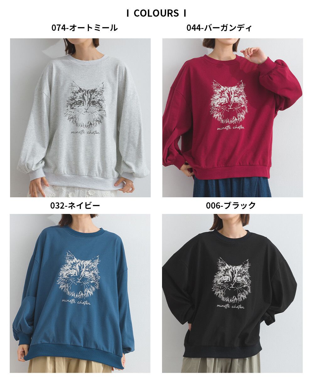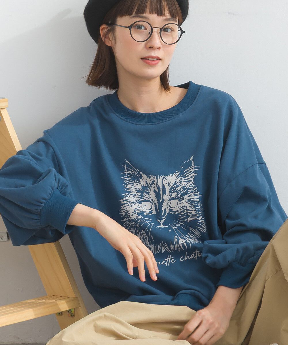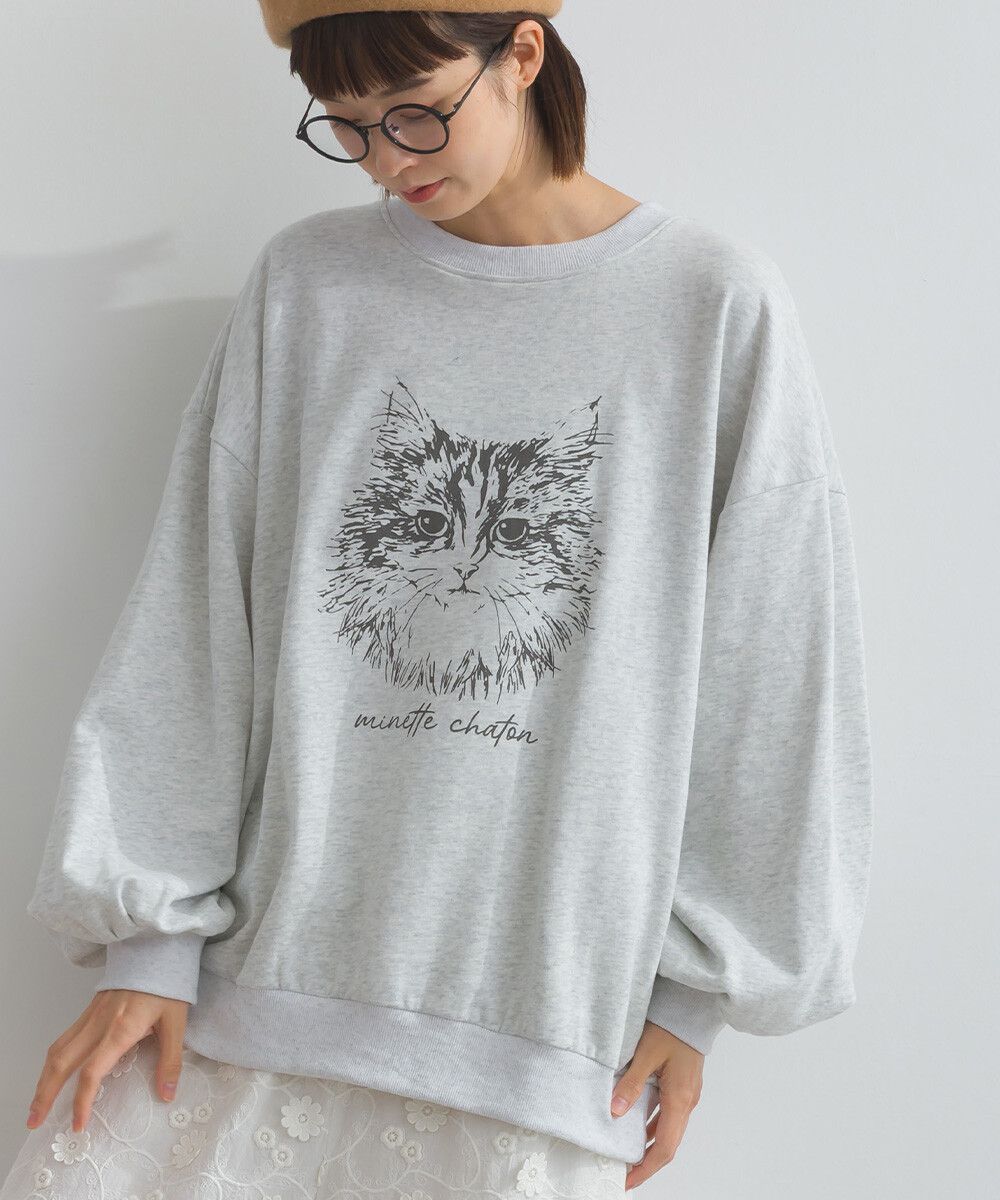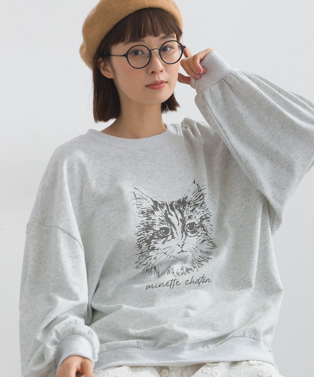 日本 Lupilien - 線條貓咪印花裏毛長袖上衣-黑