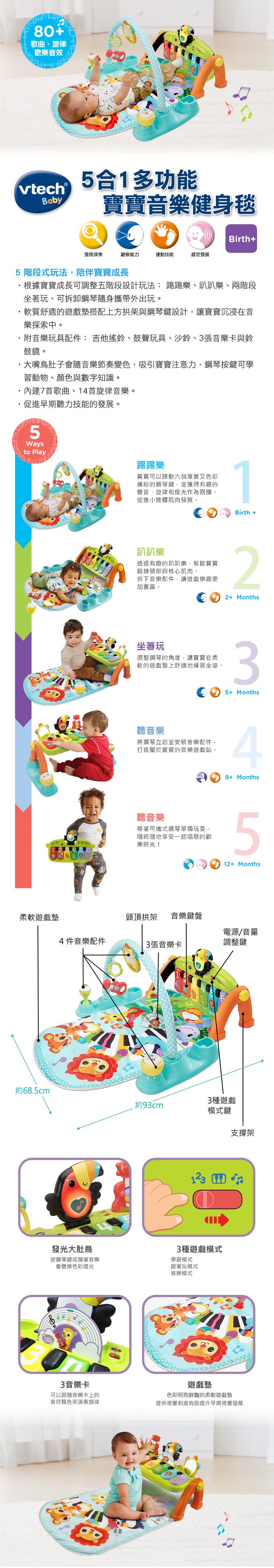 ‧根據寶寶成長可調整五階段設計玩法: 踢踢樂、趴趴樂、兩階段坐著玩、可拆卸鋼琴隨身攜帶外出玩。