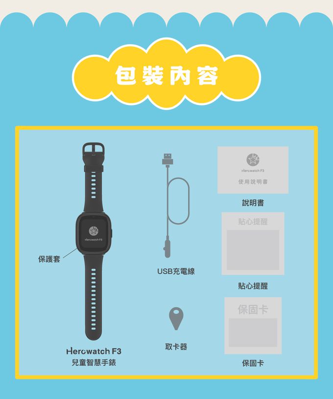 F3 兒童智慧手錶-取卡器、充電線、保護套、貼心提醒、保固卡、說明書-50g
