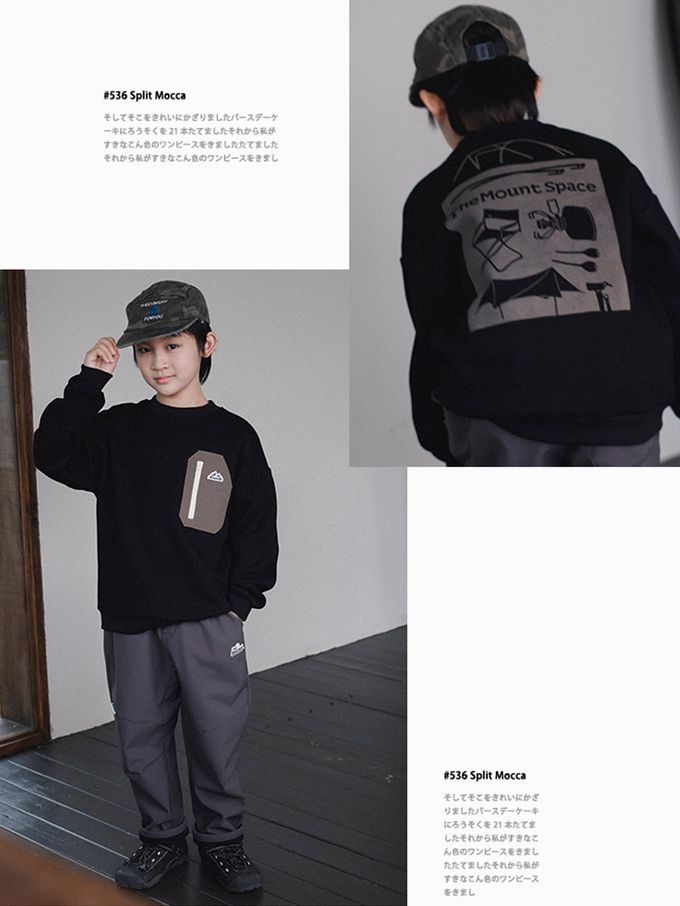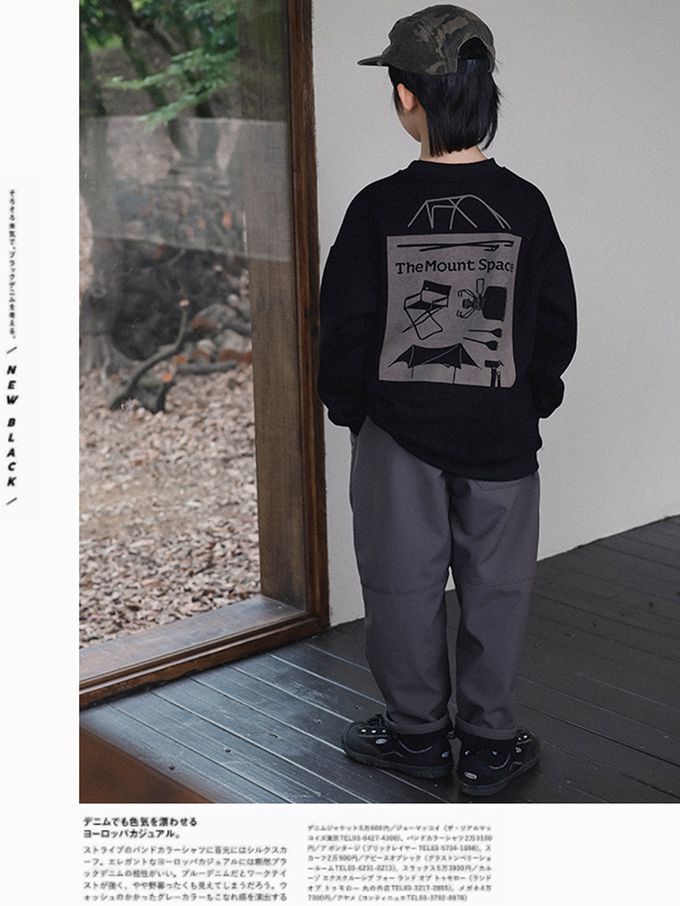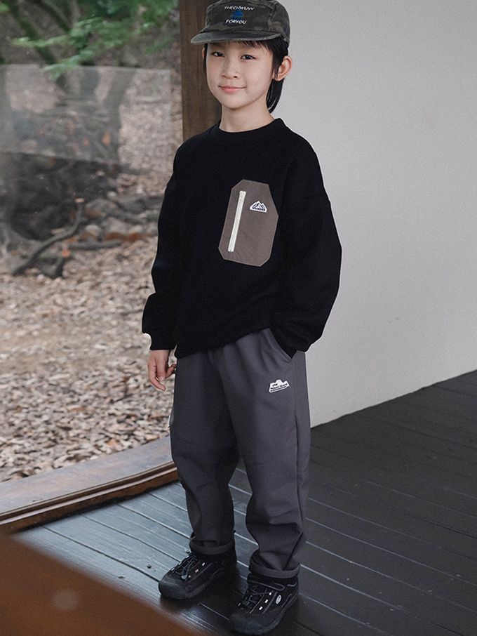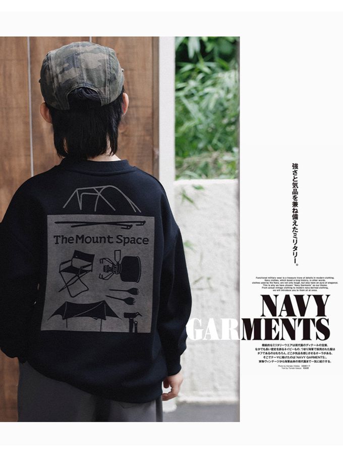 保暖加絨口袋拼接長袖上衣/大學T-後露營印花-黑色
