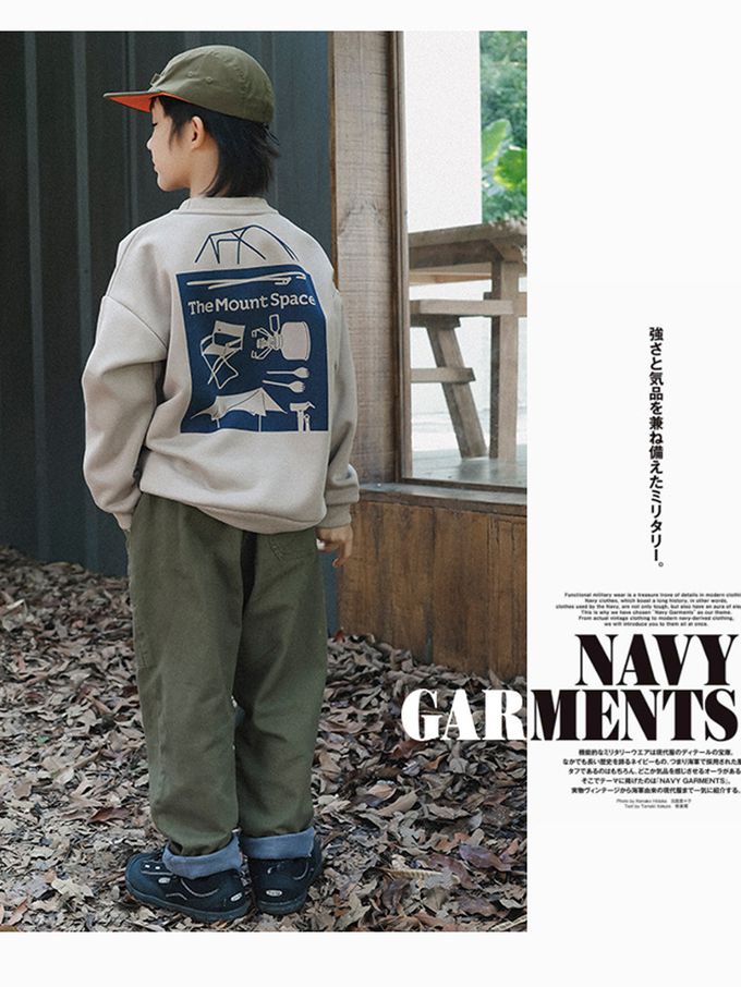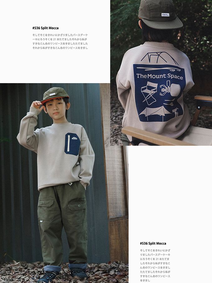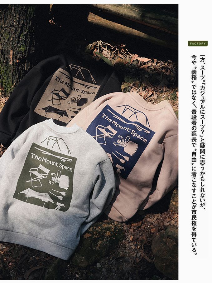 保暖加絨口袋拼接長袖上衣/大學T-後露營印花-卡其色