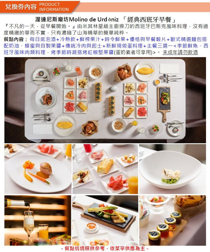 1.本券可1人於《慕舍酒店-渥達尼斯磨坊Molino de Urdániz》享米其林經典西班牙早餐1客。(已含服務費)