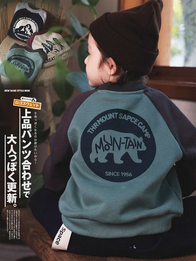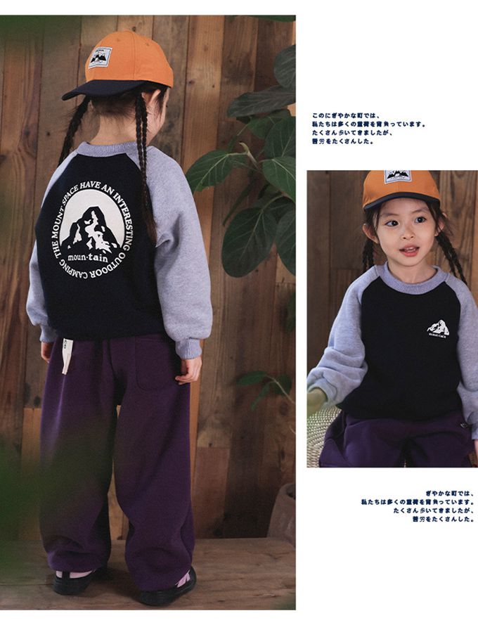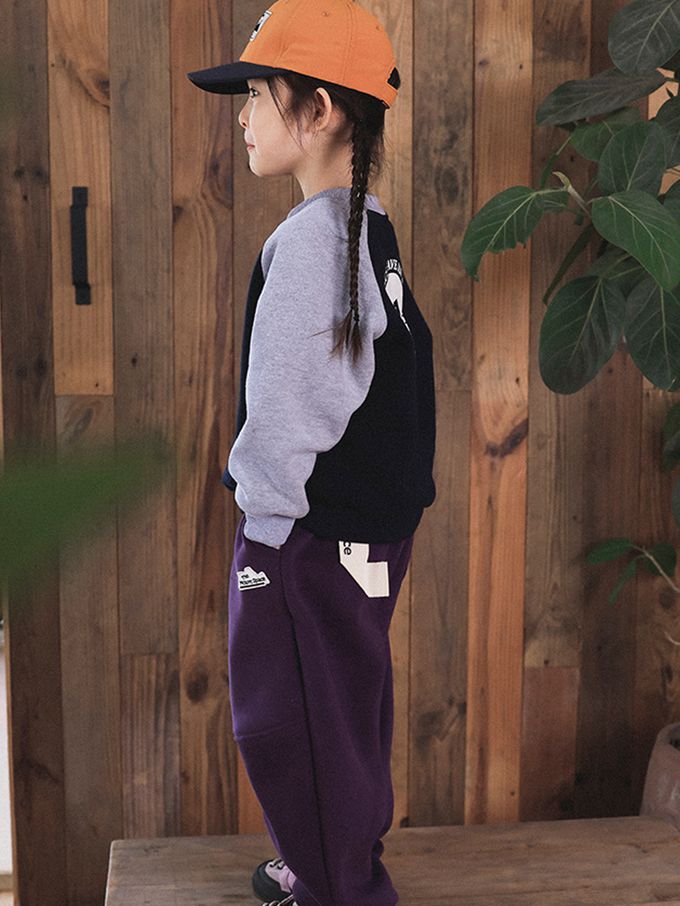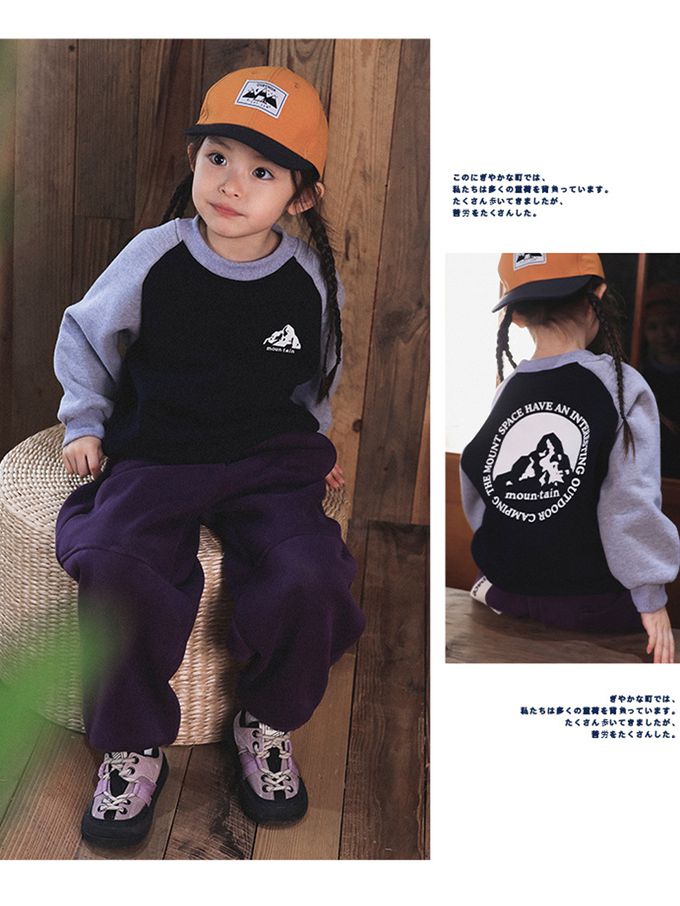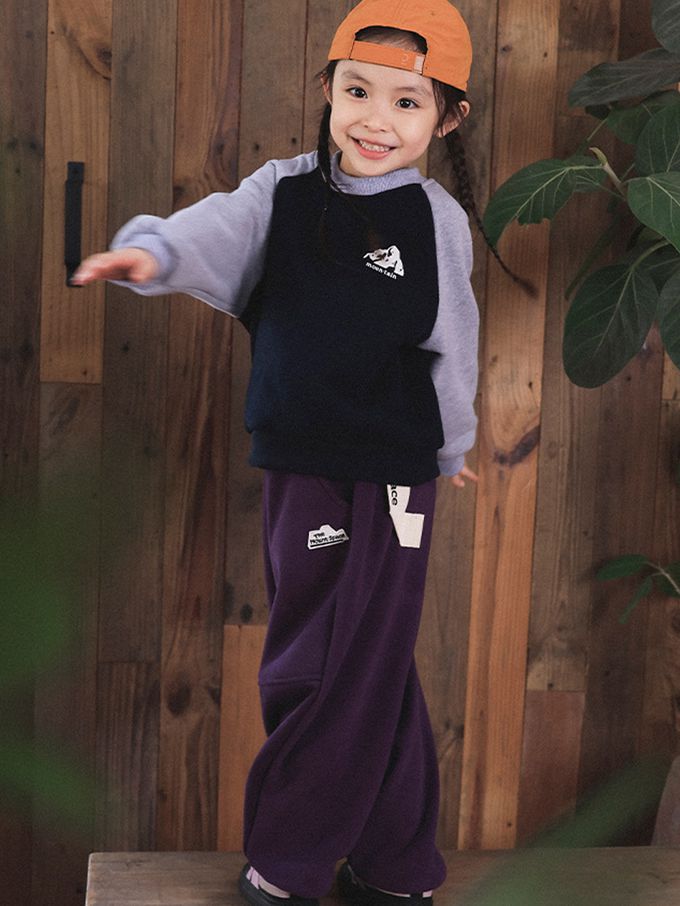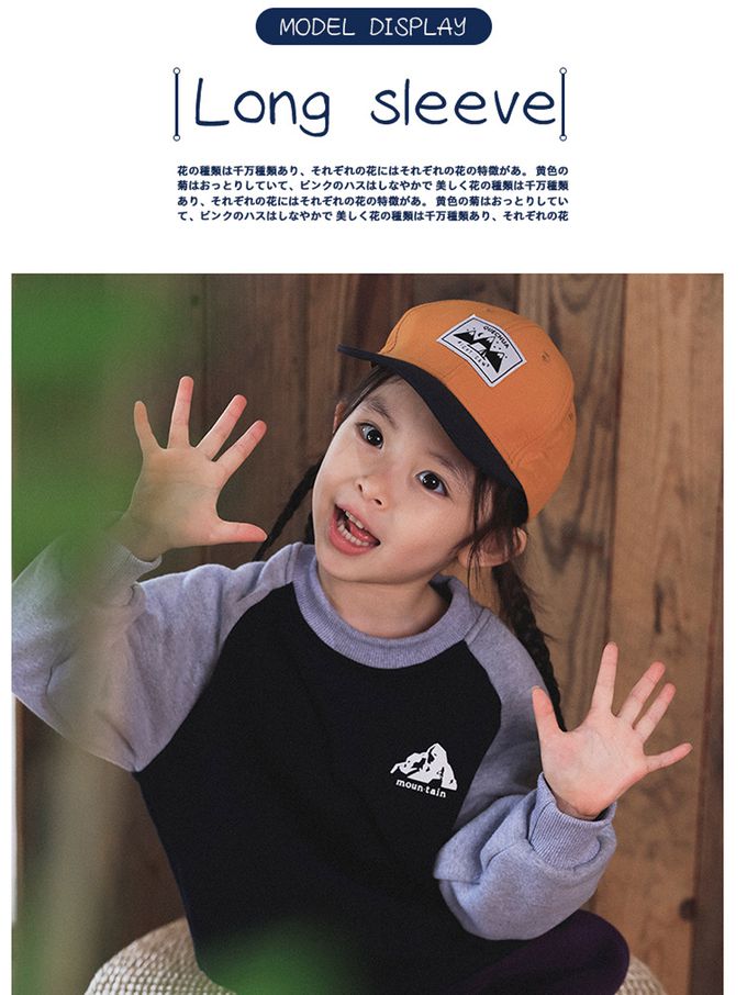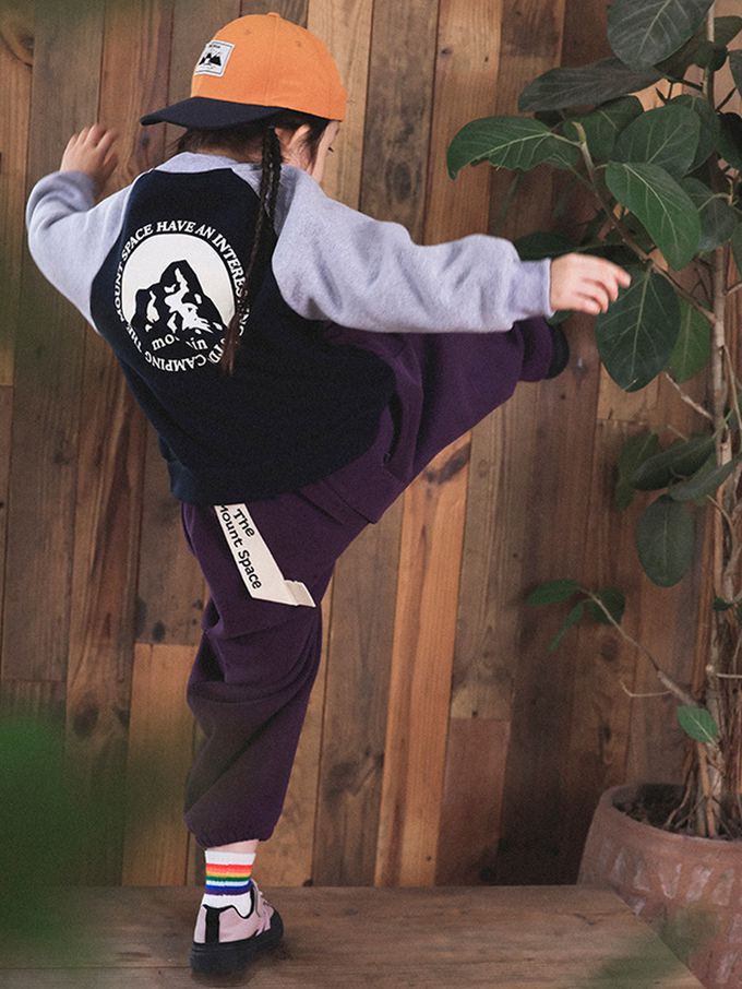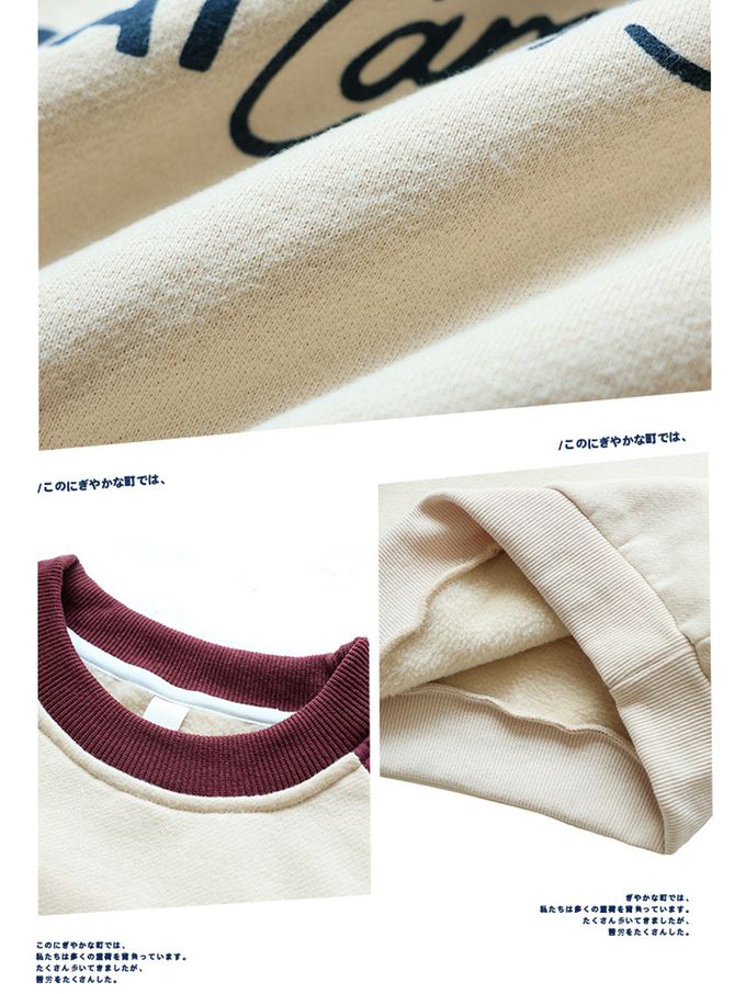加絨撞色拼接長袖上衣/大學T-前後印花-藏青