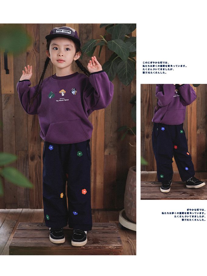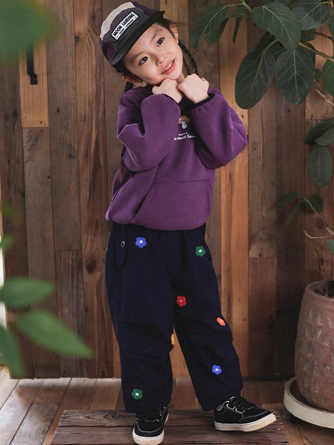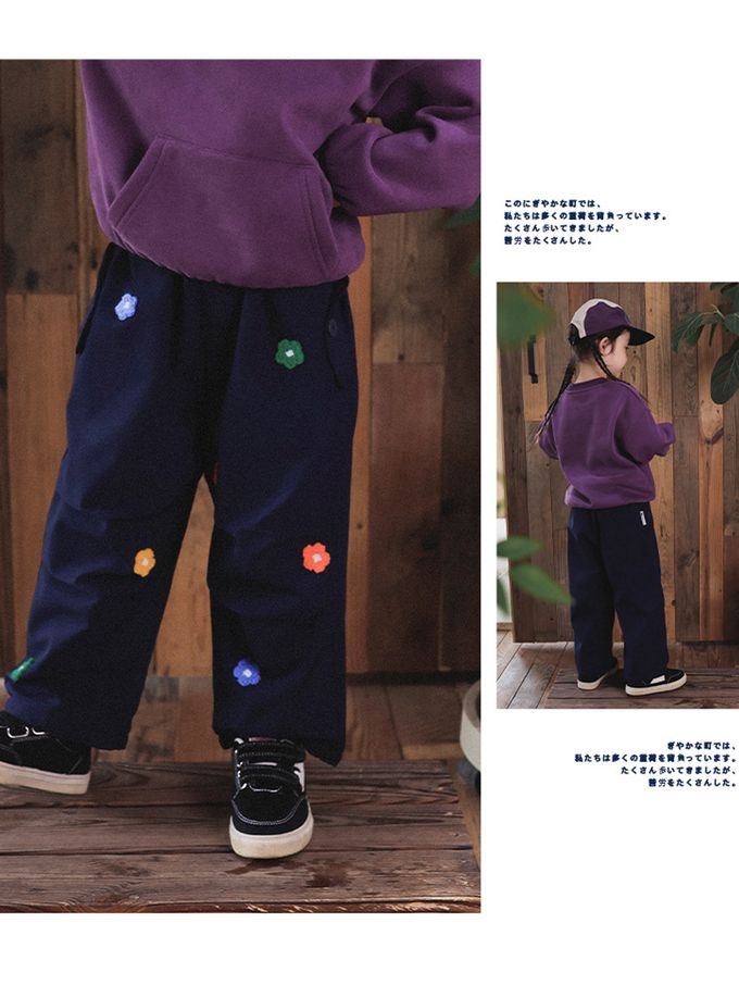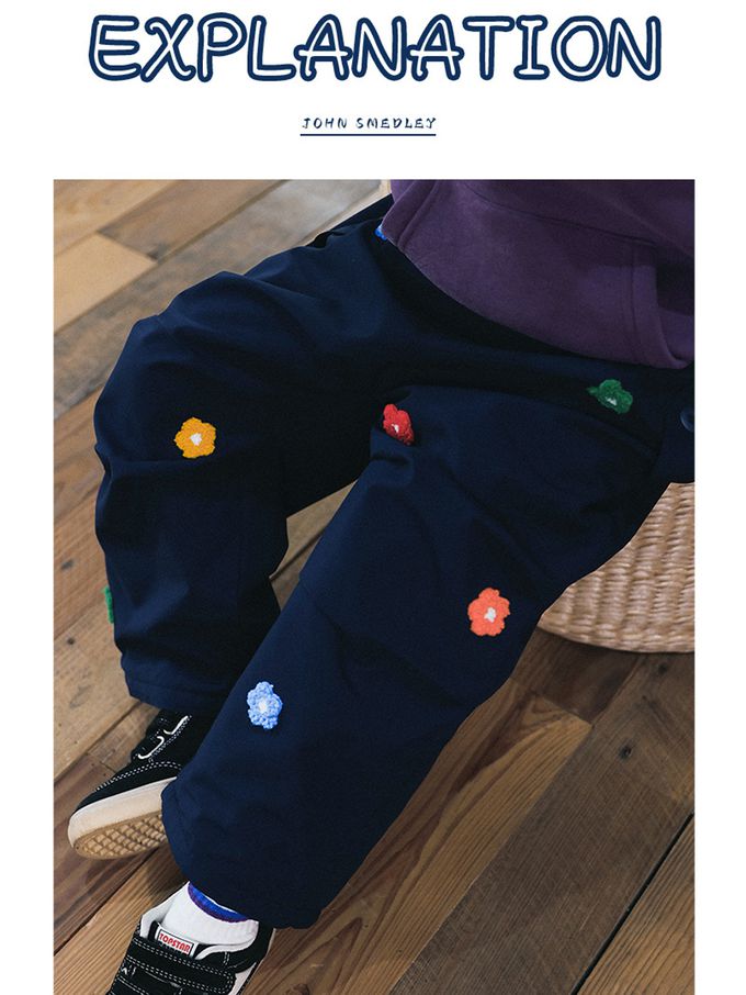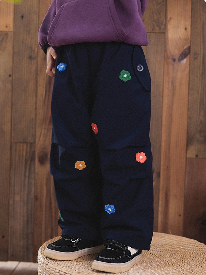 防潑水加絨保暖工裝長褲-小花刺繡-藏青