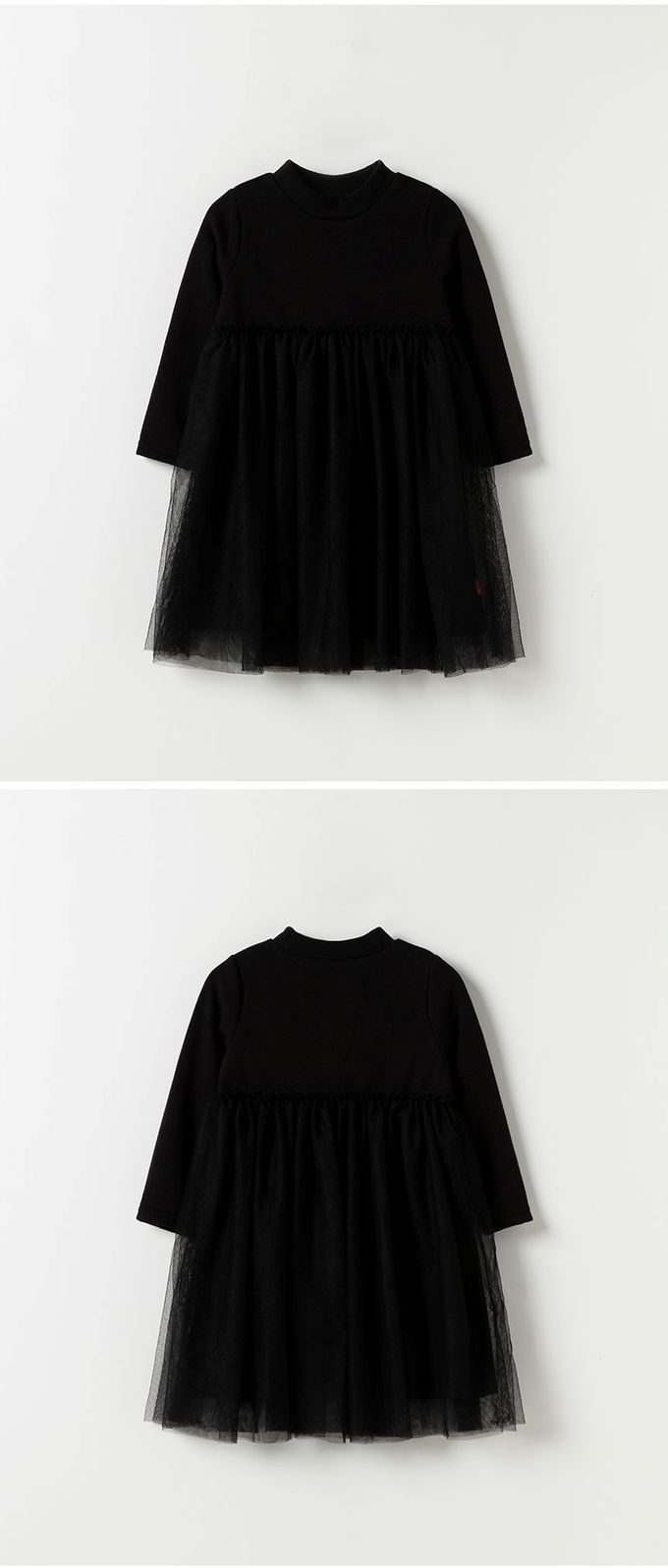 韓國 OZKIZ - (內磨毛)柔美網紗點綴中領長袖洋裝-黑