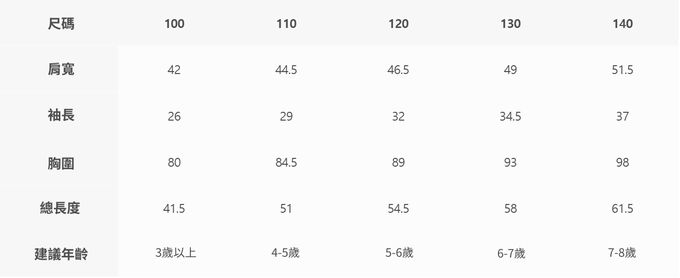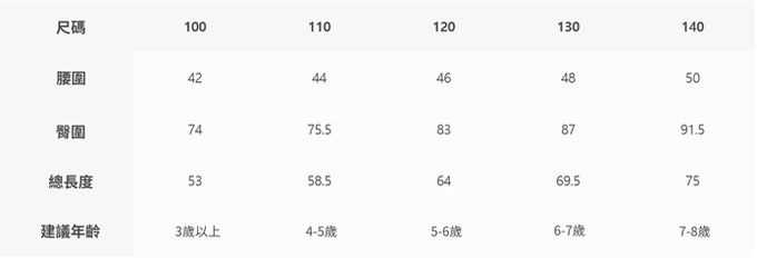 2. 尺寸表乃依平均值制定,每位孩童發育情形不同,請參考模特試穿資訊、既有衣物等,並依實際測量結果為準。