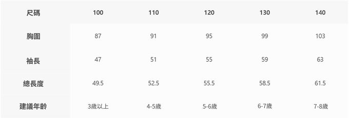 2. 尺寸表乃依平均值制定,每位孩童發育情形不同,請參考模特試穿資訊、既有衣物等,並依實際測量結果為準。