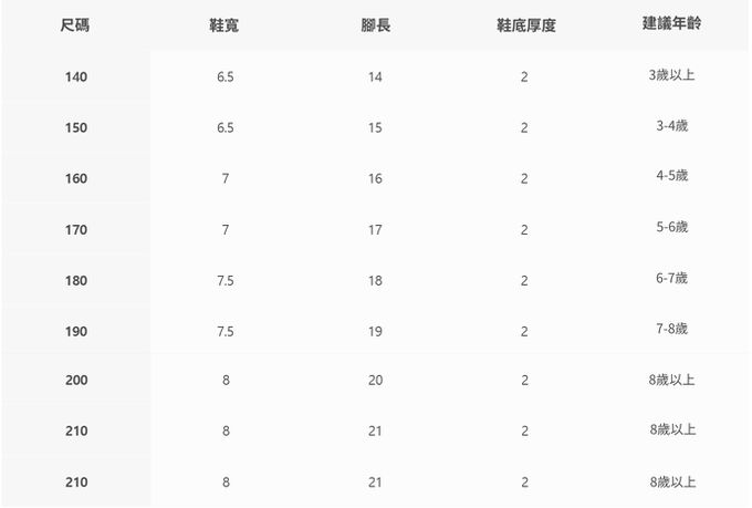 2. 每個尺寸的建議年齡、建議身高僅供參考,每位孩子發育狀況各有不同,建議參考寶貝現有的鞋子尺寸做對照。