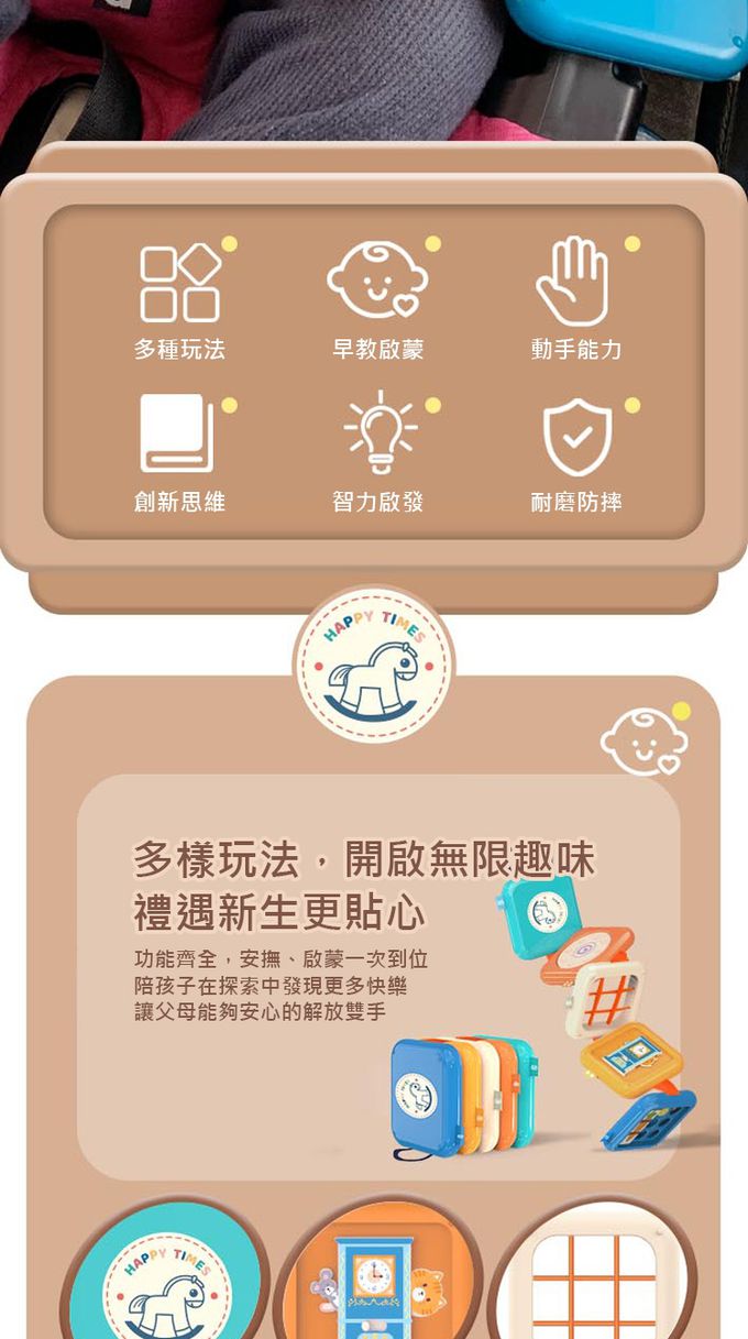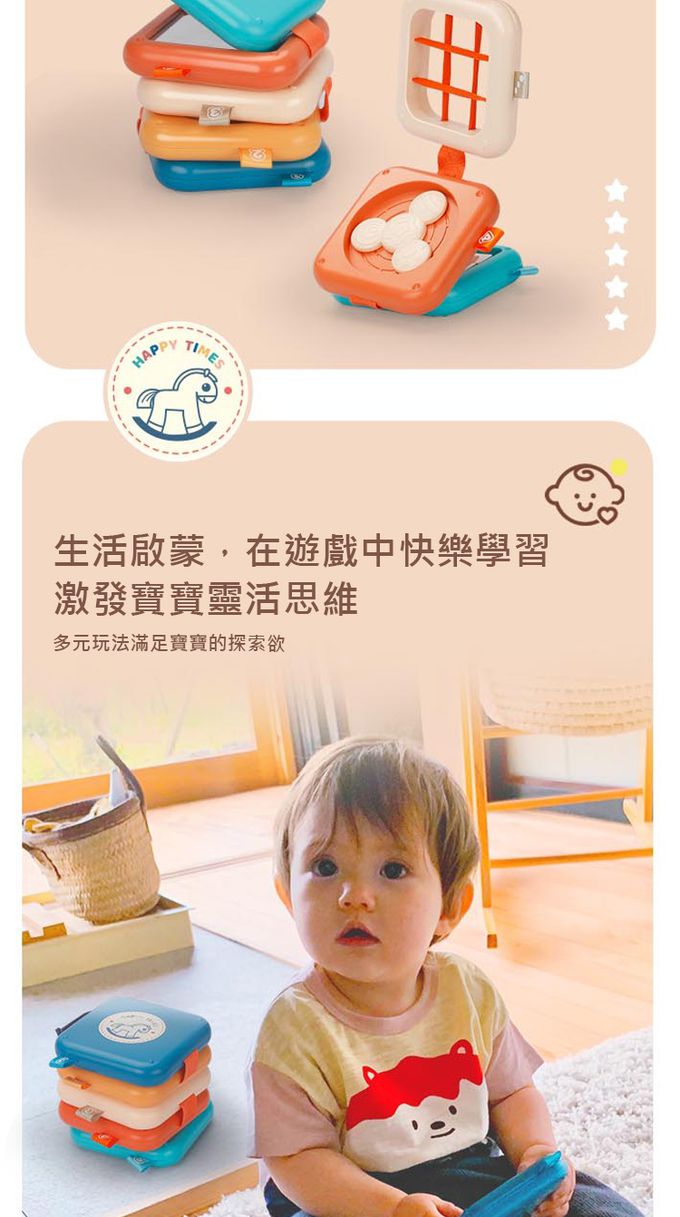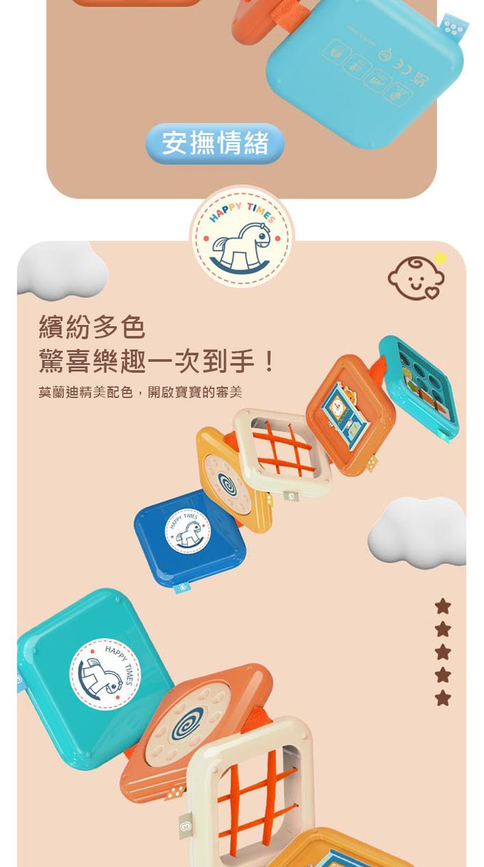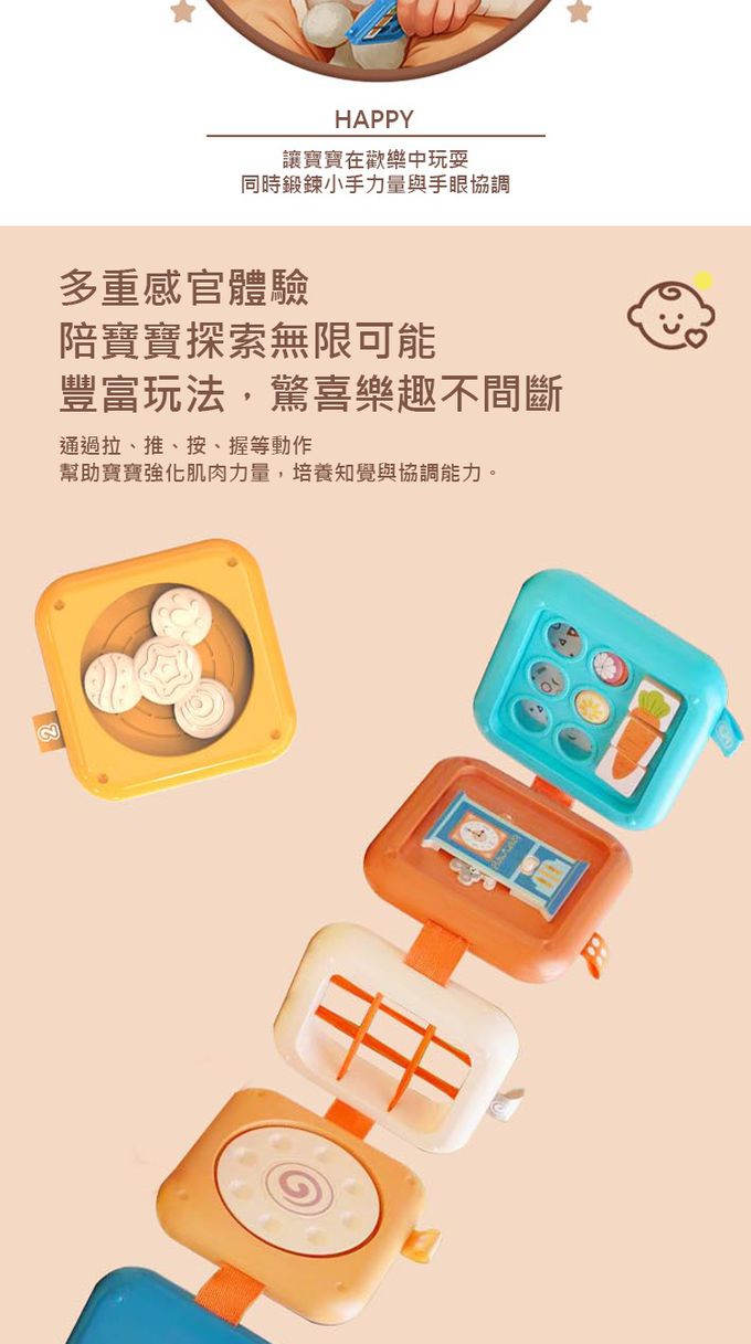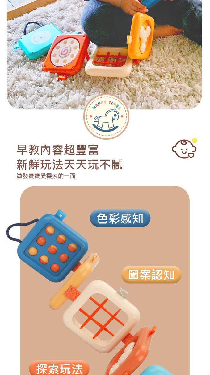 1.全面感官啟蒙設計 (8合1)-每個方塊面都設計有不同的紋理、圖案或機關(如:時鐘、按鈕、鏡子、齒輪等),刺激寶寶的視覺、觸覺和認知能力。