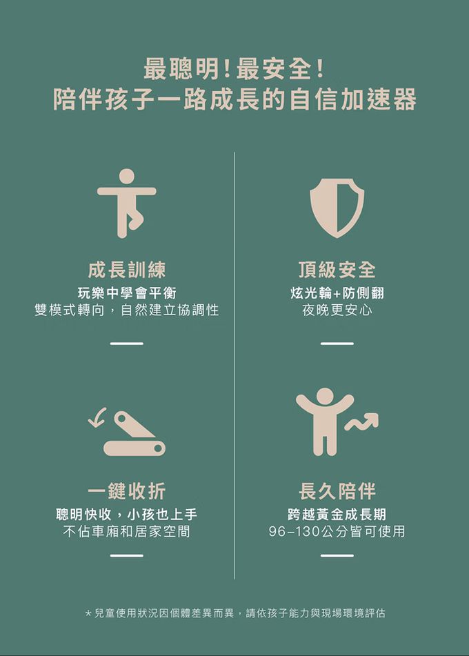 注意事項:適用年齡:3-6歲 最大承重:50kg 主要成份:鋁合金、尼龍、發光二極體、可熱塑性橡膠(TPR)、塑膠(PP、PU、PC、ABS) T把高度:約 57~83cm 商品淨重:約 3kg 產地:中國 商品檢驗標識號:R45656 【注意事項】 ● 使用本產品請穿戴安全護具。 ● 禁止於公用及一般道路使用。 ● 請在成人監督下使用。