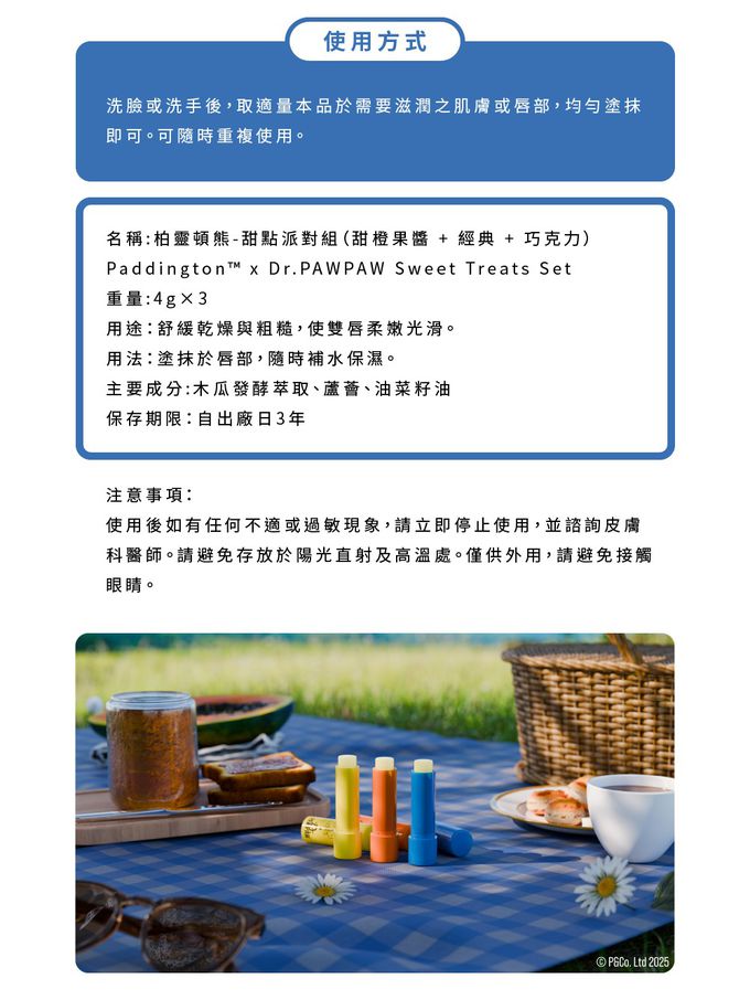 Dr.PAWPAW 帕丁頓熊™靈感甜點套裝,包含屢獲殊榮的100%純天然經典潤唇膏(棒狀)以及兩款甜美潤唇膏:橙子果醬潤唇膏和熱巧克力潤唇膏,旨在滋潤和滋養您的雙唇。套裝富含我們明星成分:木瓜(PAWPAW 果),以其深層滋養功效而備受推崇;蘆薈,有助於舒緩和呵護您的雙唇;蓖麻油和橄欖油,以其卓越的保濕功效而精心挑選。是您甜蜜冒險的完美伴侶。