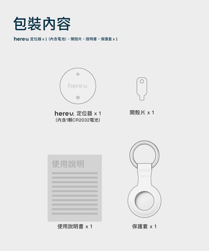 內容物:定位器x1、說明書x1、保護套x1、開殼片 x1、CR2032電池型號 x1