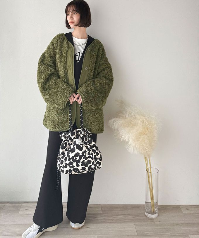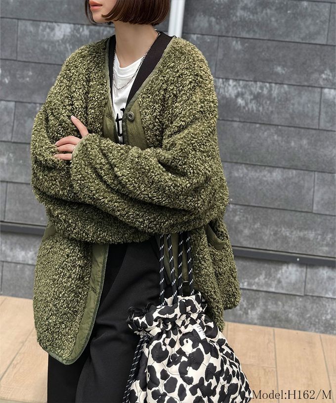 日本 Classical Elf - Java 異素材保暖毛絨無領寬版外套-軍綠