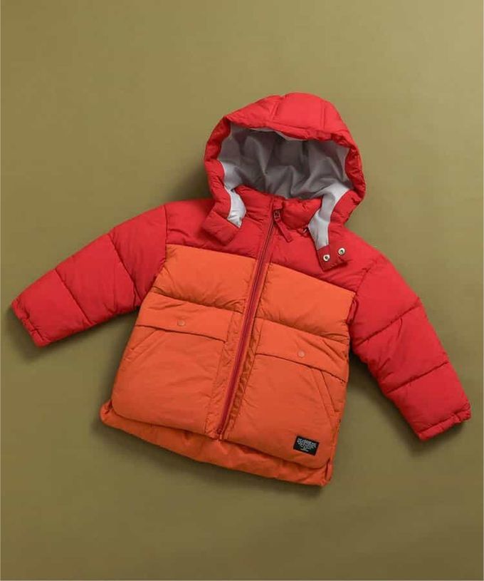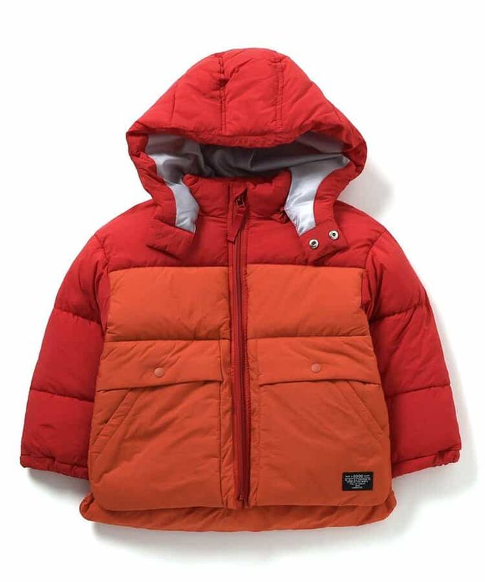 日本 BREEZE - [可機洗]蓬鬆輕盈時尚連帽保暖外套-撞色-橘紅