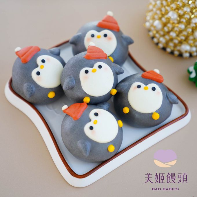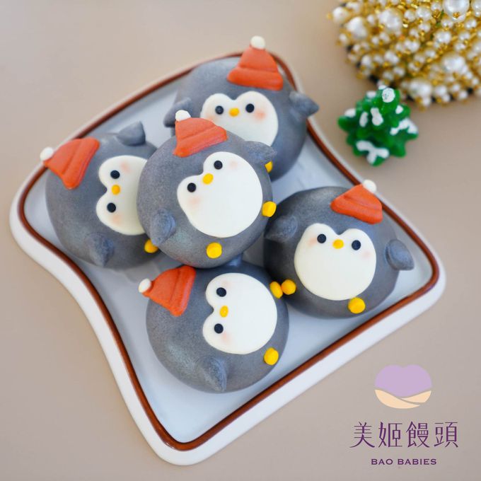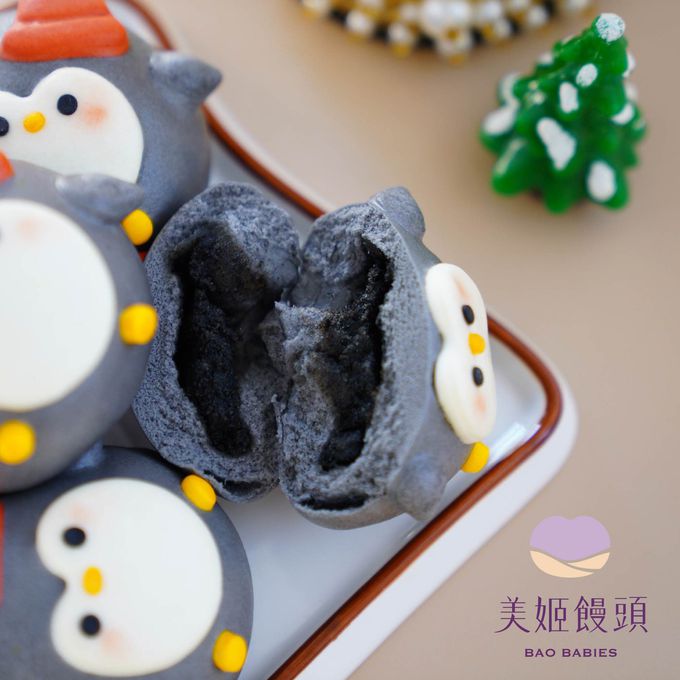 聖誕小企鵝鮮乳造型芝麻包,採用SQF-Level 3最高等級驗證麵粉,內餡採用獨家研發芝麻餡,香甜可口,大人小孩都喜歡。