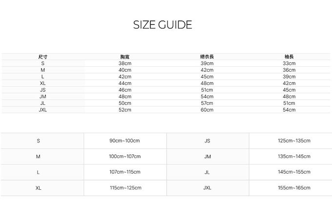 S[90~100cm]、M[100~107cm]、L[107~115cm]、XL[115~125cm]、JS[125~135cm]、JM[135~145cm]、JL[145~155cm]、JXL[155~165cm]