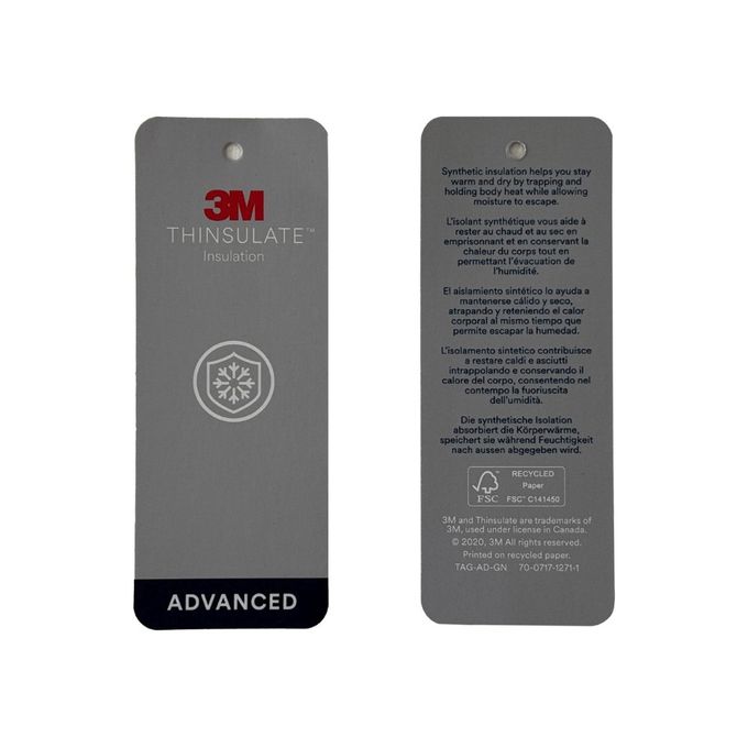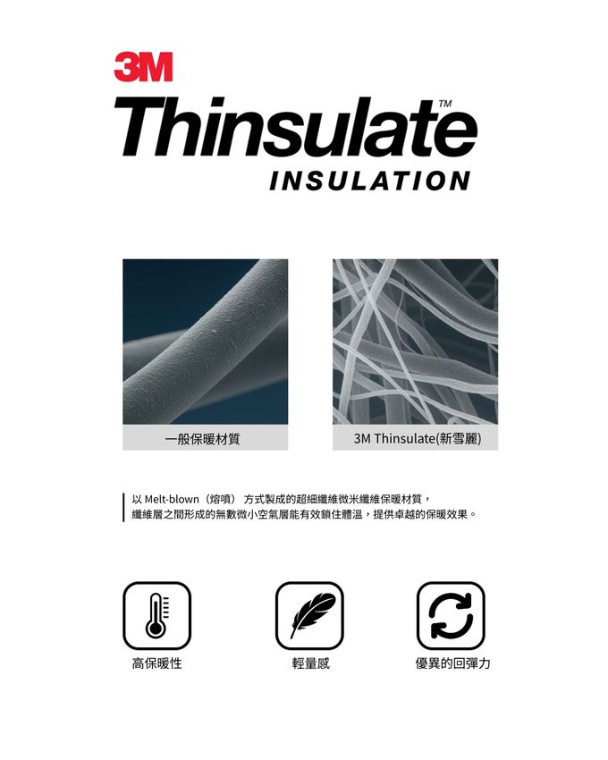 • 保持乾燥溫暖 與天然羽絨不同,Thinsulate™ 纖維是親水性低的材質。即使在潮濕環境或出汗後,它仍能保持大部分的保暖性能,並能快速乾燥。