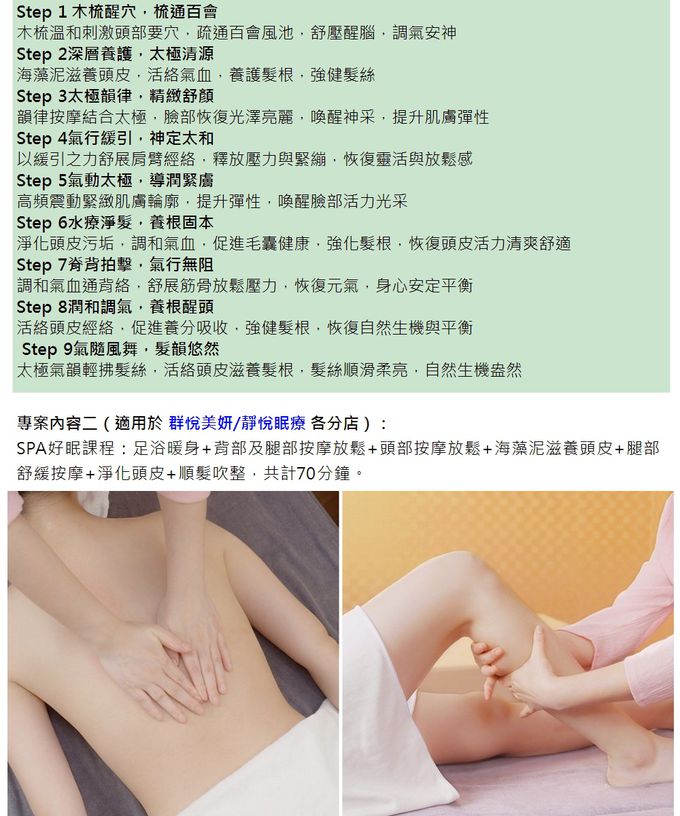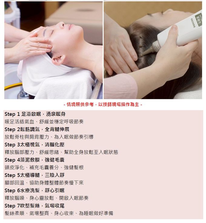 ※SPA好眠課程:足浴暖身+背部及腿部按摩放鬆+頭部按摩放鬆+海藻泥滋養頭皮+腿部舒緩按摩+淨化頭皮+順髮吹整,共計70分鐘。