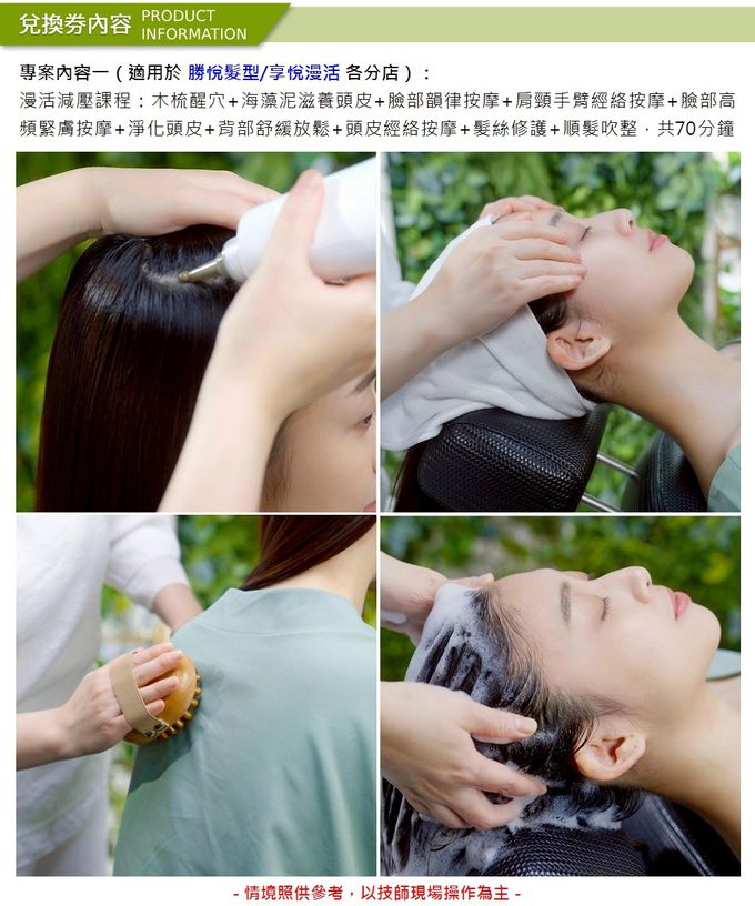 ※漫活減壓課程:木梳醒穴+海藻泥滋養頭皮+臉部韻律按摩+肩頸手臂經絡按摩+臉部高頻緊膚按摩+淨化頭皮+背部舒緩放鬆+頭皮經絡按摩+髮絲修護+順髮吹整,共計70分鐘。