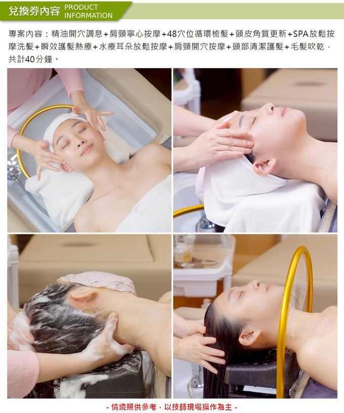 內容:精油開穴調息+肩頸寧心按摩+48穴位循環梳髮+頭皮角質更新+SPA放鬆按摩洗髪+瞬效護髮熱療+水療耳朵放鬆按摩+肩頸開穴按摩+頭部清潔護髮+毛髮吹乾,共計40分鐘。