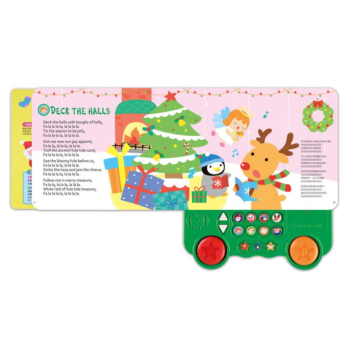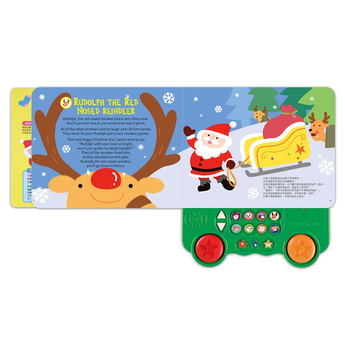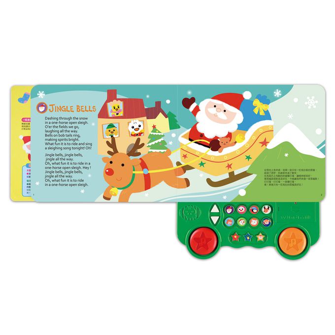 本產品精選8首耳熟能詳的聖誕歌謠,以標準美式英文發音,讓孩子歡唱學英文。內含3種鈴鼓聲,並附上左右雙鼓,讓孩子敲敲打打,感受歡樂的聖誕氣氛。精美又鮮豔活潑的插圖帶給孩子豐富視覺享受,並附上中文翻譯,培養英文聽力與中文閱讀習慣,是給孩子最棒的聖誕禮物!