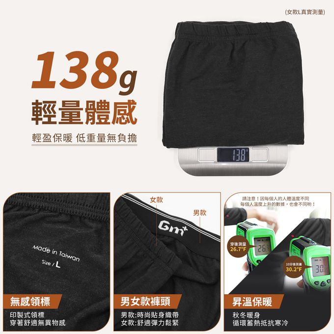 材質:19%台灣莫代爾纖維 22%遠紅外線負離子雙效聚酯纖維 19%中空保溫聚酯纖維 5%吸濕發熱聚丙烯酸醋纖維 29%棉 6%彈性纖維