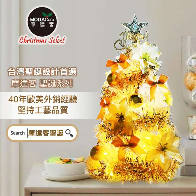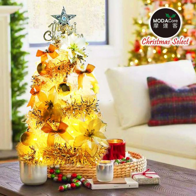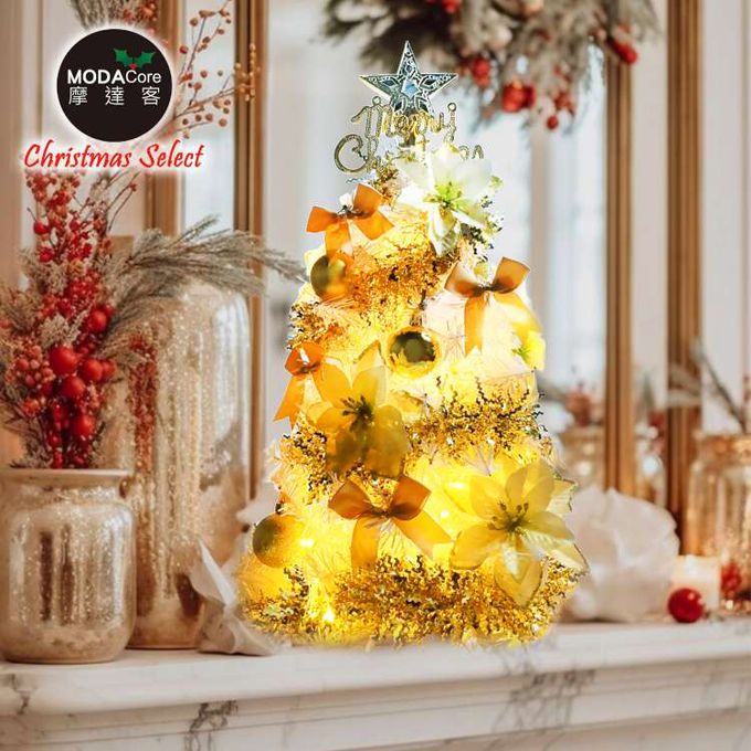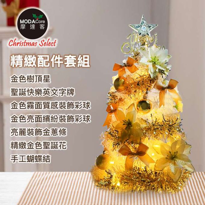 台灣製2尺(60cm)精緻白色聖誕樹+富貴雙金聖誕花系飾品組+50燈LED燈串暖白光-USB電池盒兩用充電/本島免運費MIT歐美外銷款
