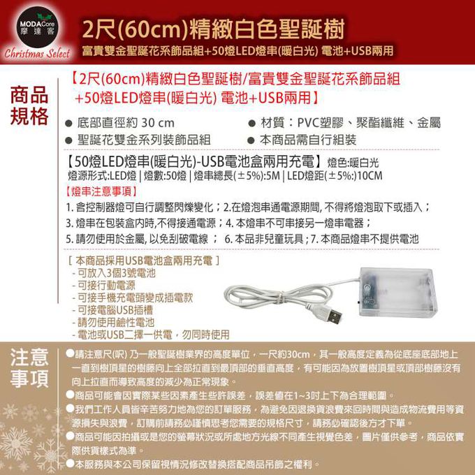 品名:台灣製2尺(60cm)精緻白色聖誕樹+富貴雙金聖誕花系飾品組+50燈LED燈串暖白光-USB電池盒兩用充電/本島免運費MIT歐美外銷款