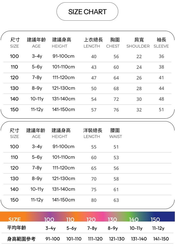 1. 尺寸表單位皆為公分(cm),實際尺寸會因布料彈性、水洗、測量起迄點等因素略有誤差。建議參考孩子平時穿著衣物尺寸進行選購。
