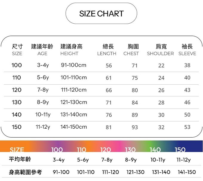 1. 尺寸表單位皆為公分(cm),實際尺寸會因布料彈性、水洗、測量起迄點等因素略有誤差。建議參考孩子平時穿著衣物尺寸進行選購。