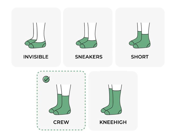 各種襪子的大約長度如下,上排由左至右:隱形襪/船型襪、短襪、短筒襪;下排由左至右:中筒襪、長筒襪。