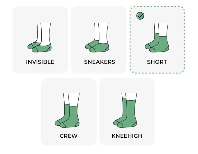 各種襪子的大約長度如下,上排由左至右:隱形襪/船型襪、短襪、短筒襪;下排由左至右:中筒襪、長筒襪。