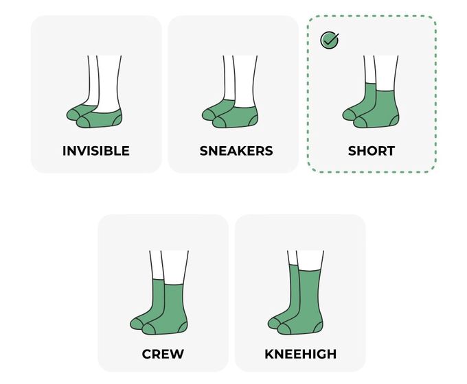 各種襪子的大約長度如下,上排由左至右:隱形襪/船型襪、短襪、短筒襪;下排由左至右:中筒襪、長筒襪。
