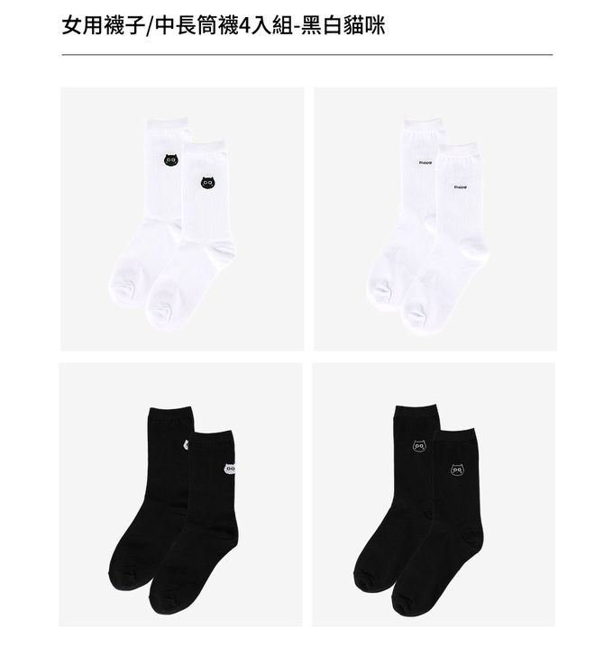 韓國 Daily Like - 女用襪子/中長筒襪4入組-黑白貓咪 (220~250mm)
