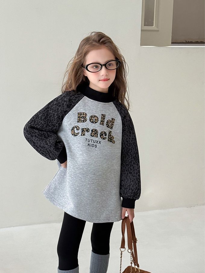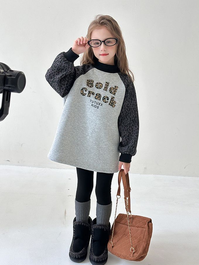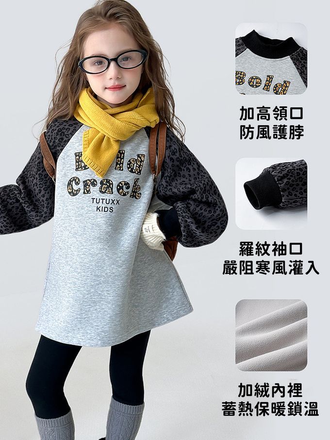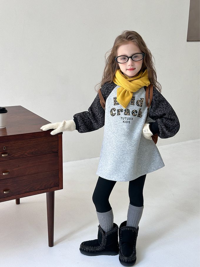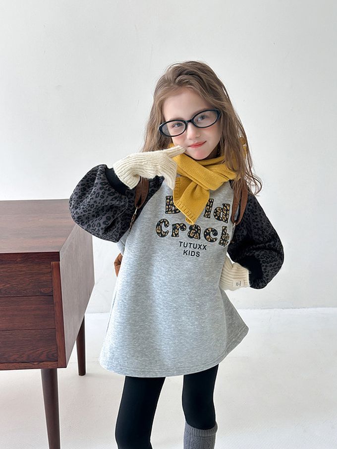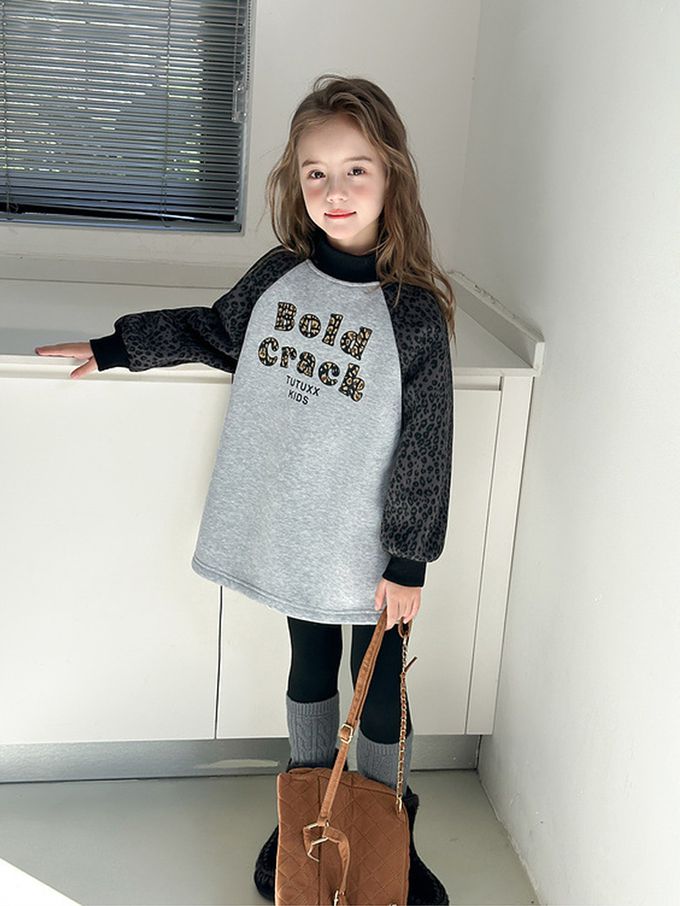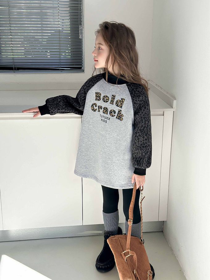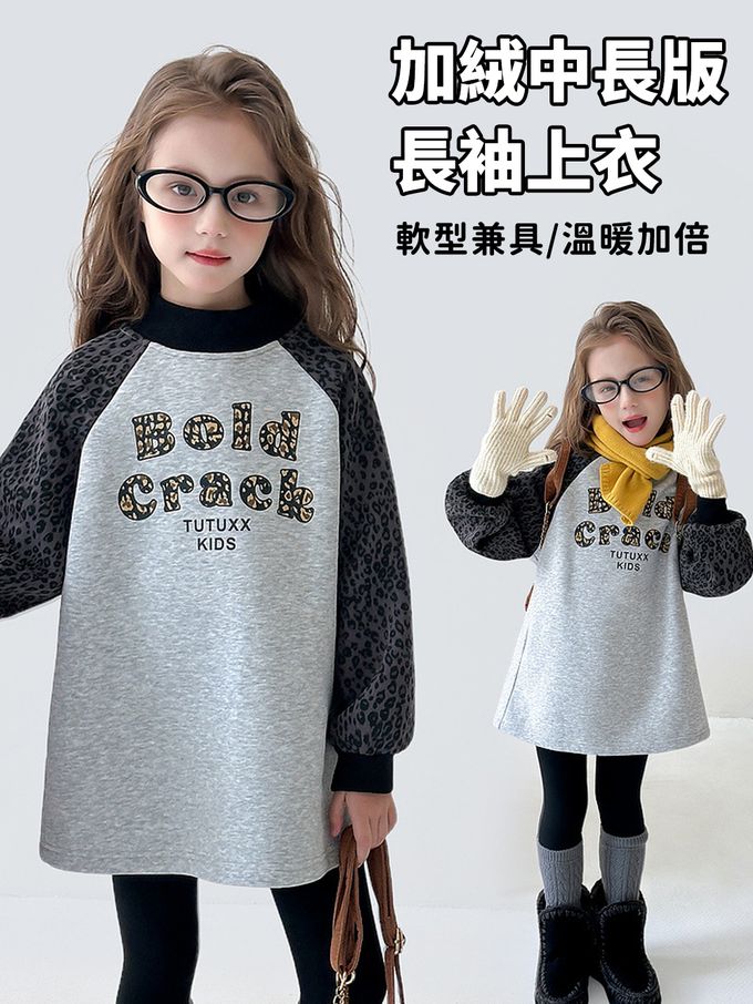 加絨中長版長袖上衣/大學T-豹紋-灰色