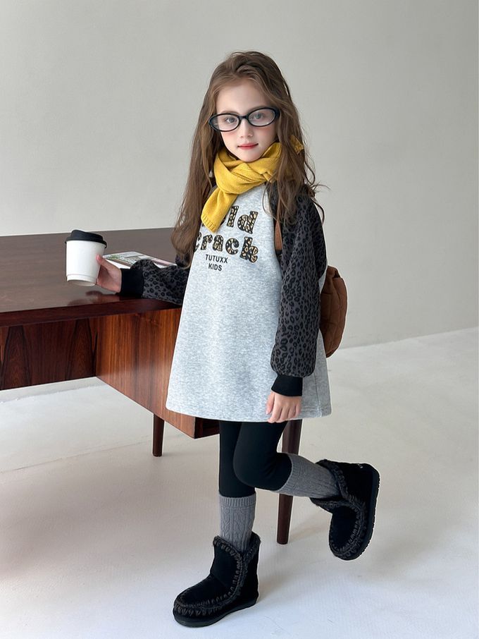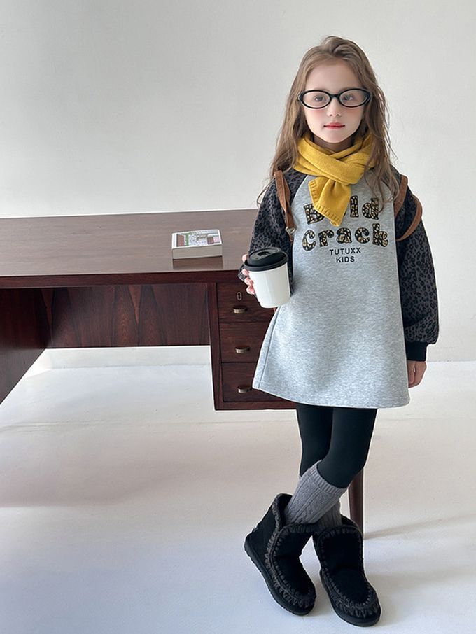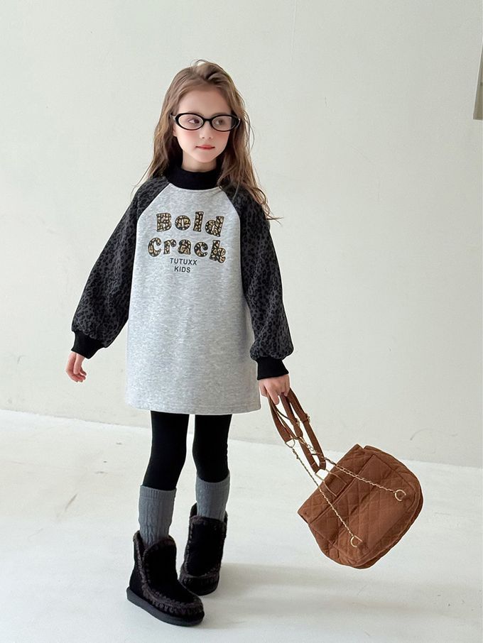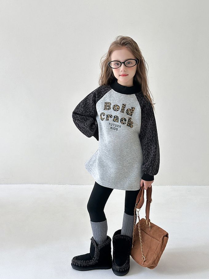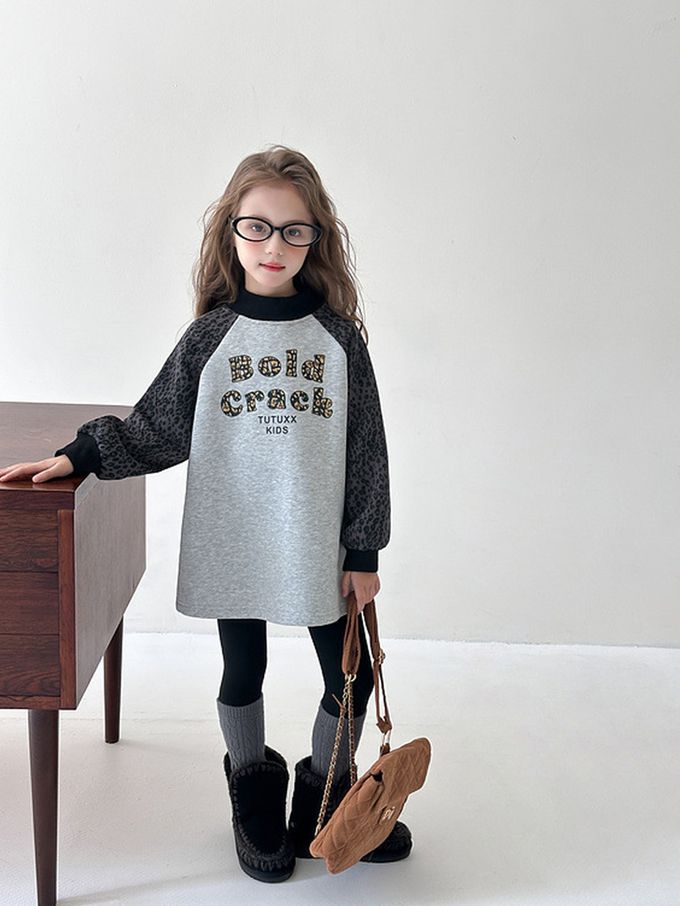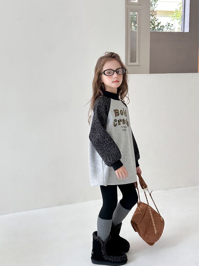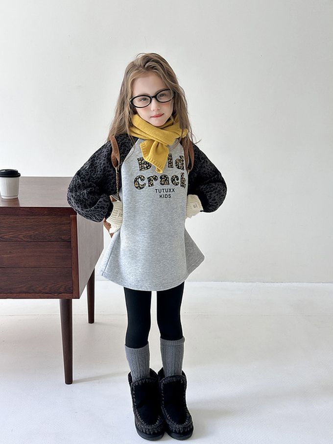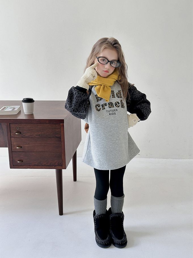 加絨中長版長袖上衣/大學T-豹紋-灰色