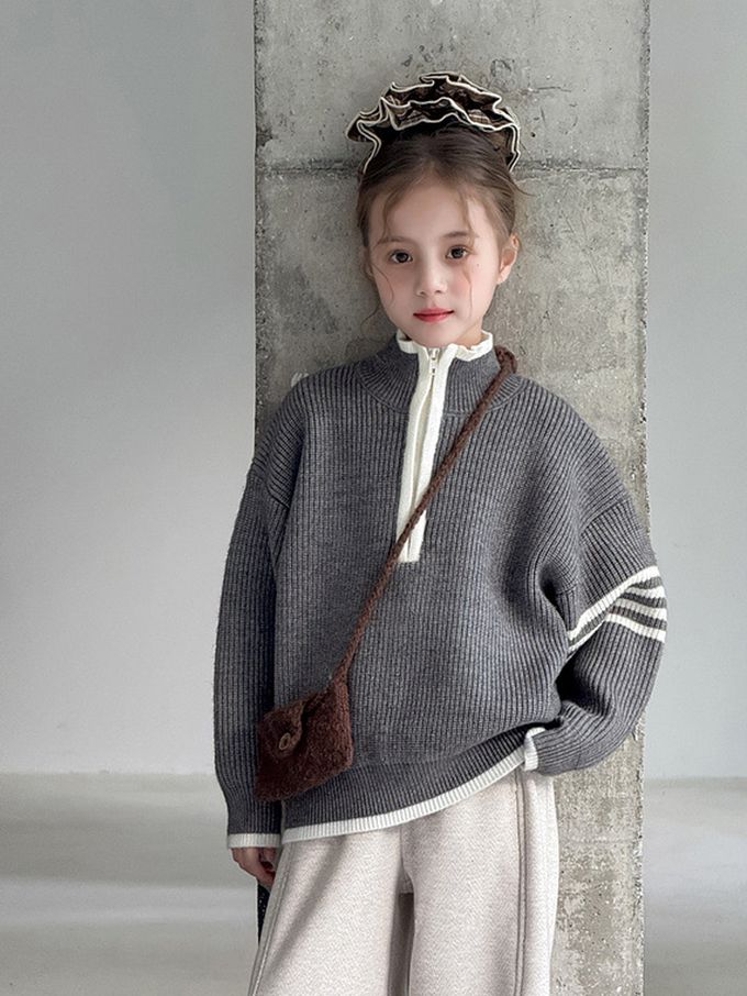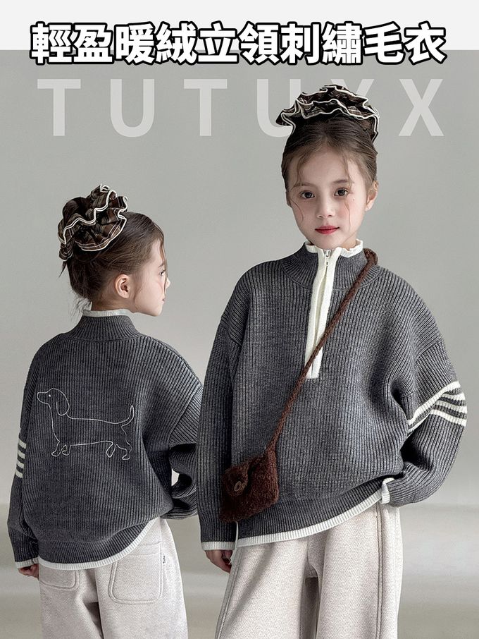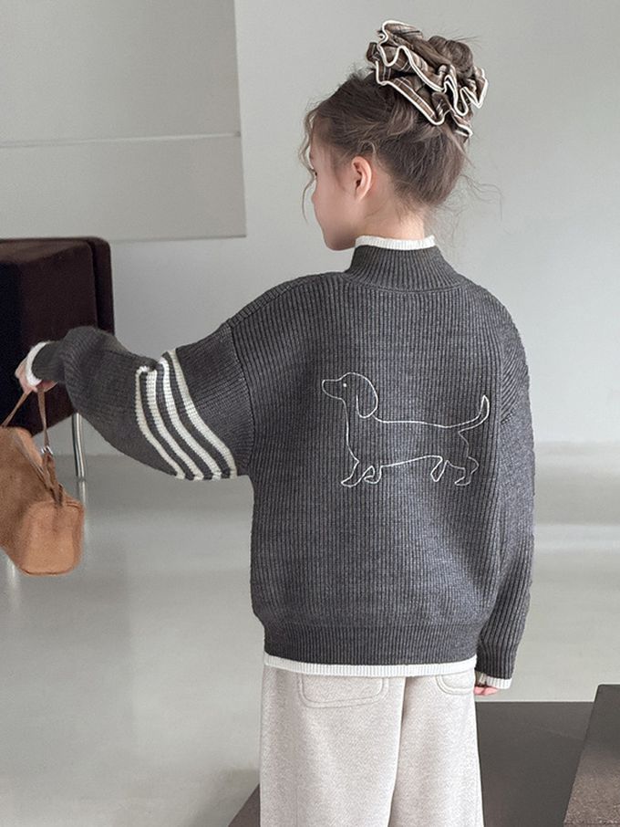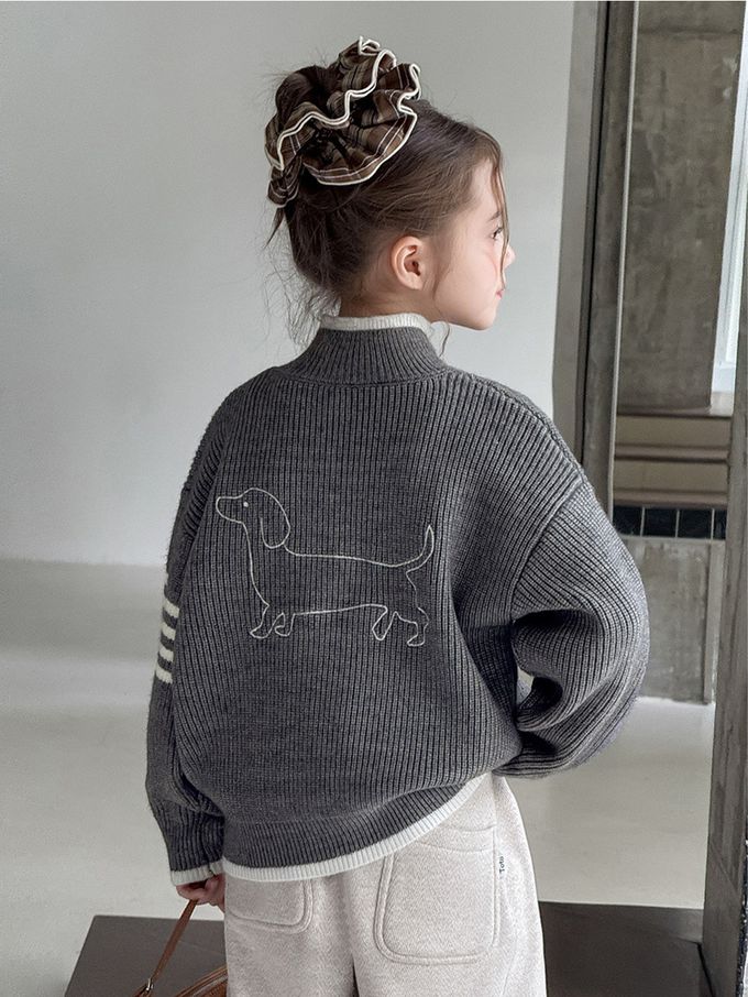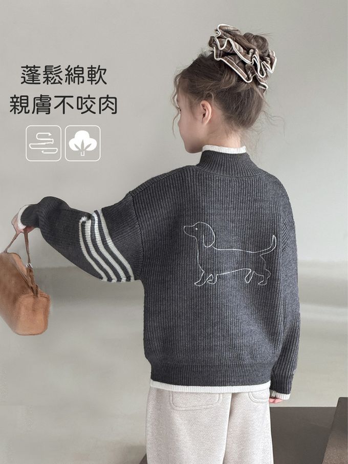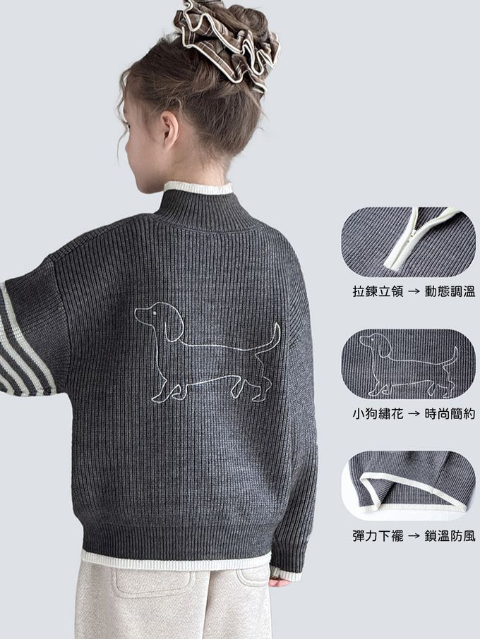 輕盈暖絨立領刺繡毛衣-小狗-灰色