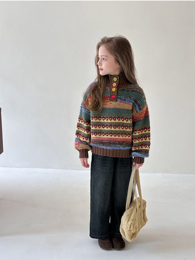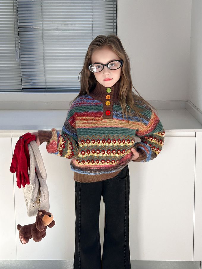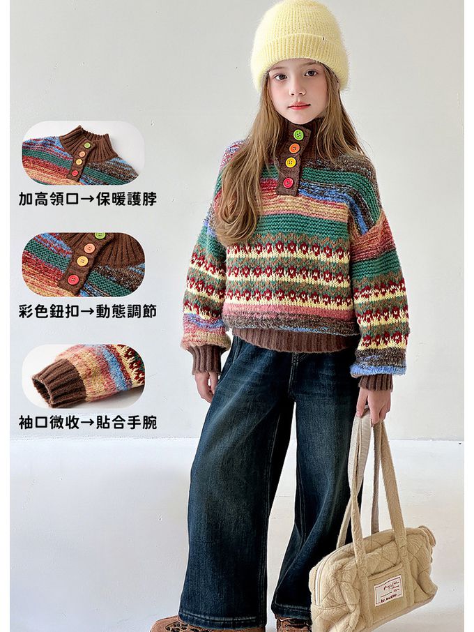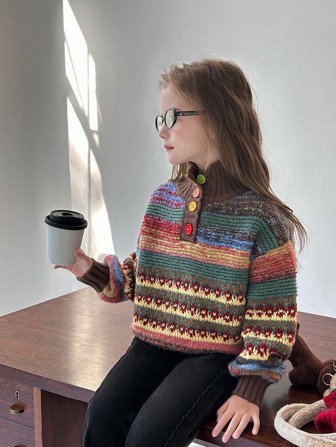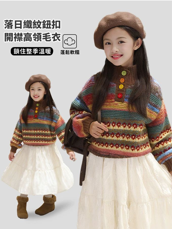 落日織紋鈕扣開襟高領毛衣-彩色條紋