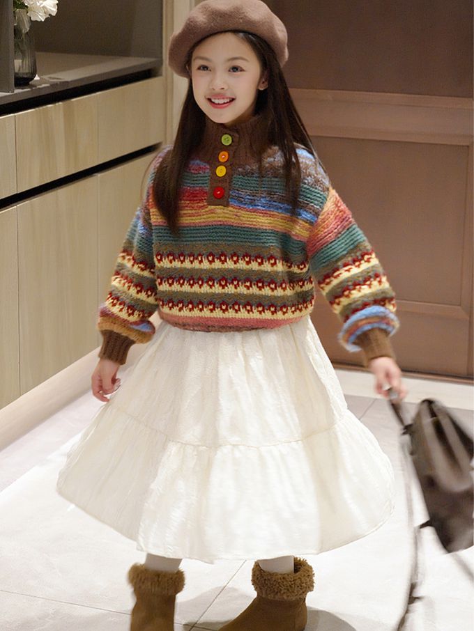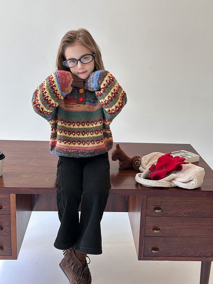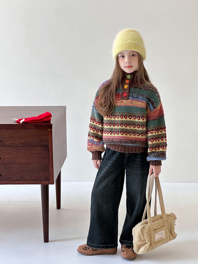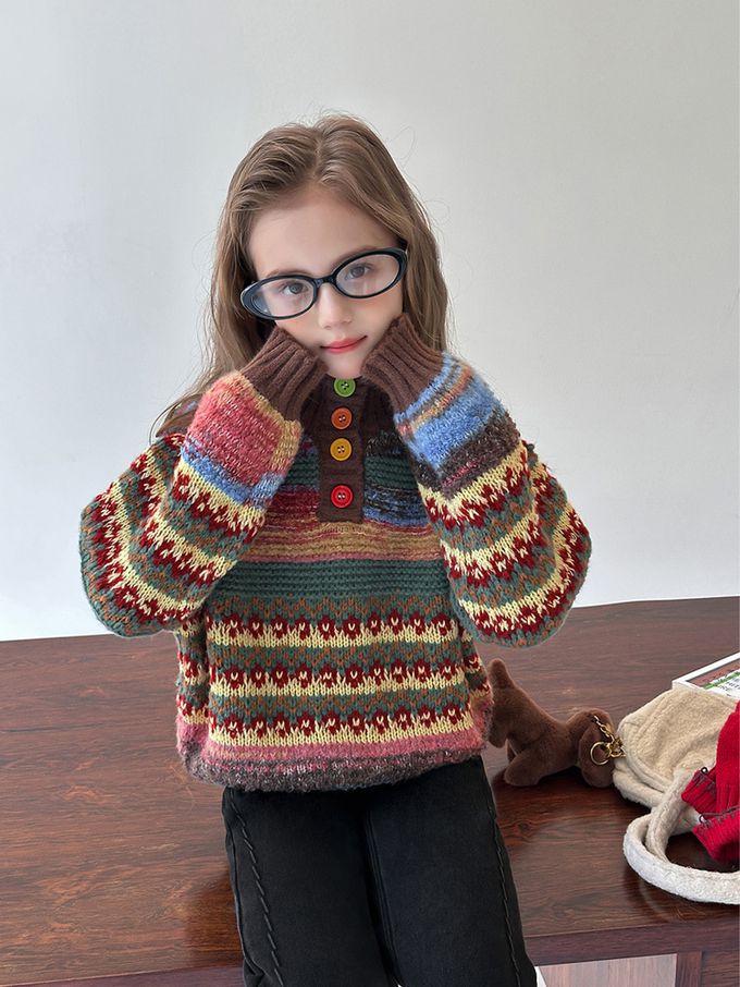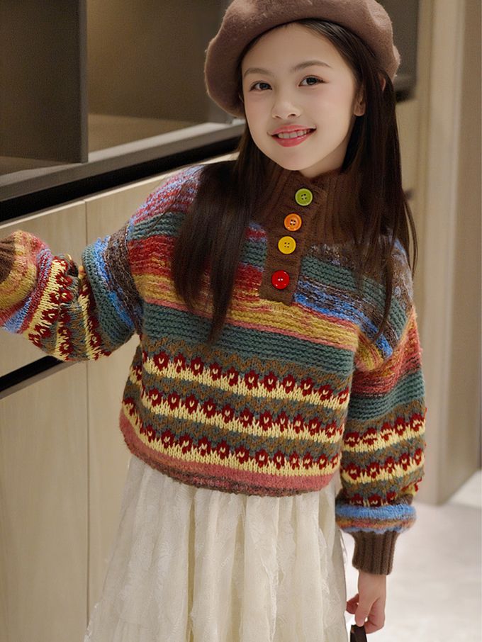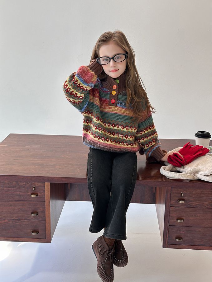 落日織紋鈕扣開襟高領毛衣-彩色條紋