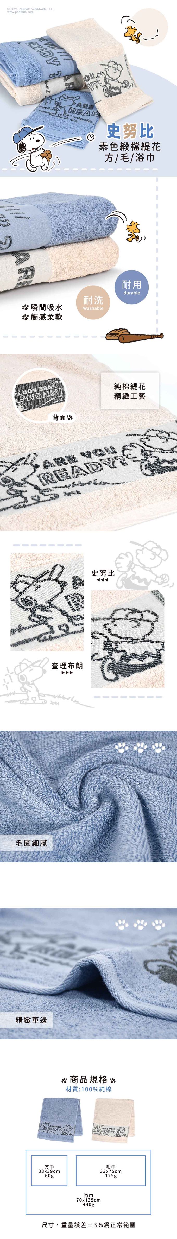 品名:【SNOOPY史努比】2件組純棉素色緞檔緹花方巾浴巾各1